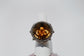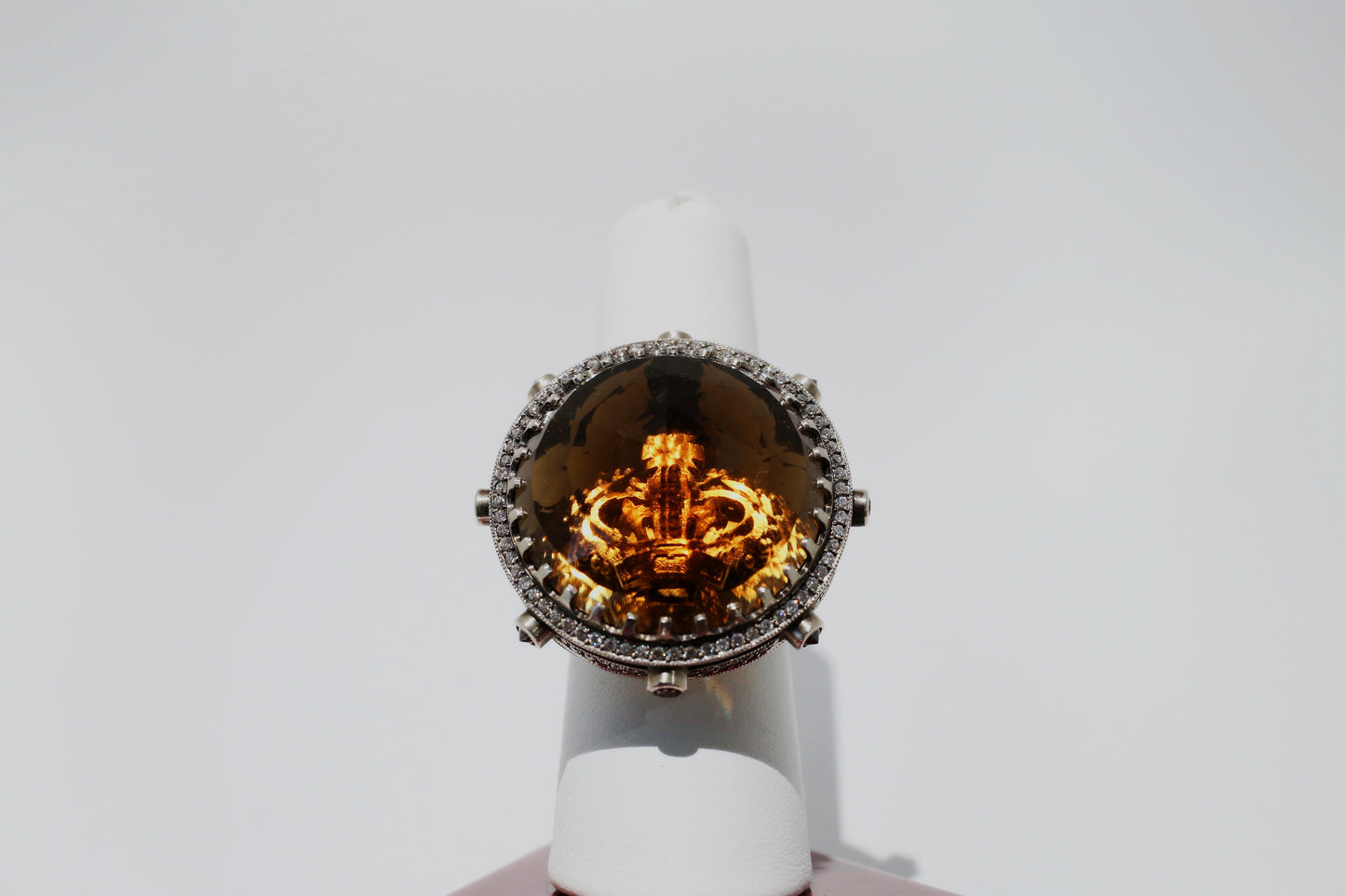 This striking KISUM ring showcases a bold design in 14k white and yellow gold. The architectural band features a central gold beaded channel framed by rows of white diamonds, adding texture and brilliance. The oversized smoky quartz is the showstopper—cut with a high domed top and a flat, cabochon-like underside that reveals a hidden golden crown motif beneath the surface. The gemstone is secured in a wide, detailed bezel accented with small chocolate and white diamonds, lending contrast and depth. From every angle, the ring blends regal drama with precision craftsmanship, resulting in a piece that is both sculptural and symbolic—elevating the traditional cocktail ring into something far more mysterious and modern.