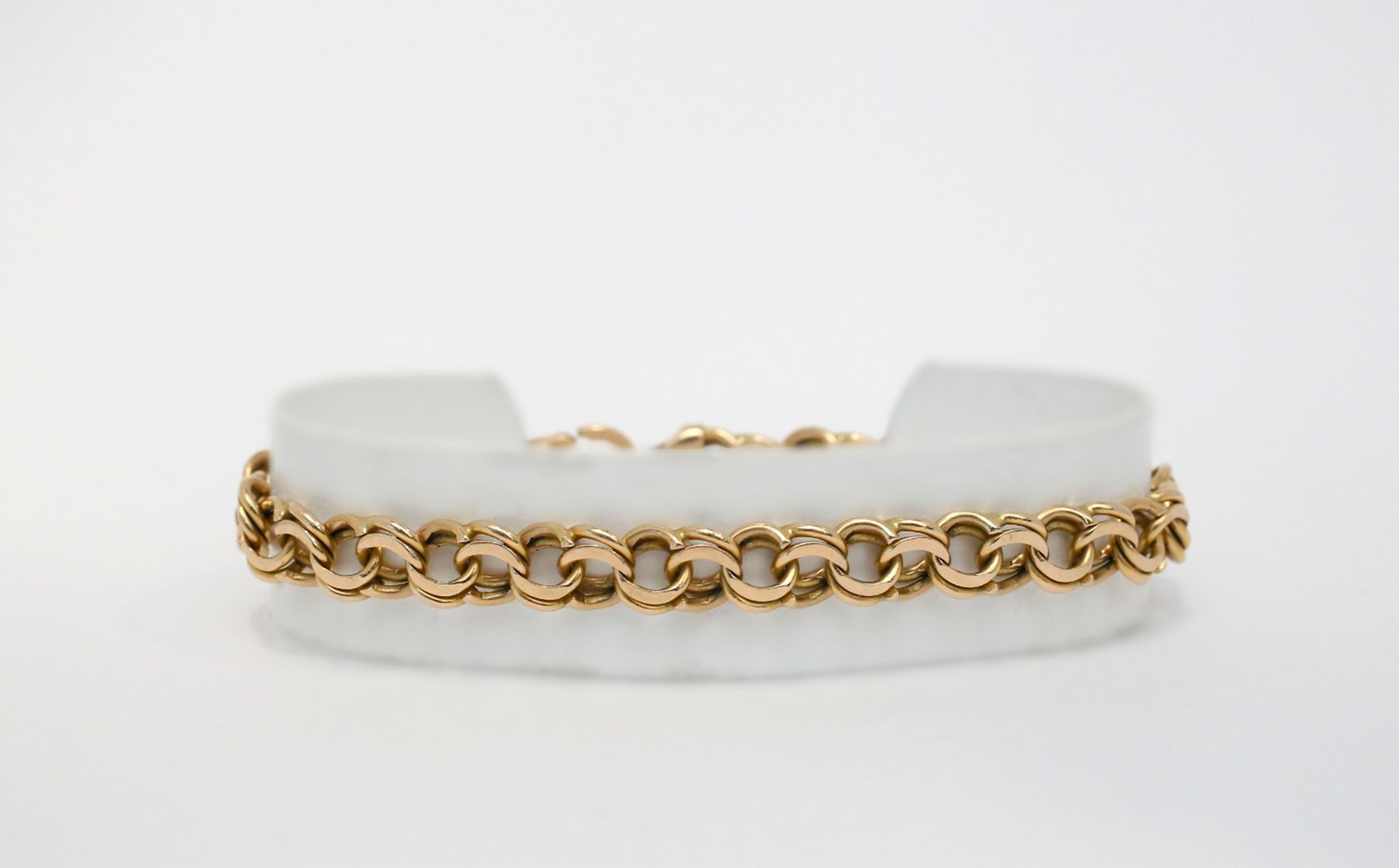 This classic 14k yellow gold charm bracelet features a bold double-link design, perfect for showcasing your favorite charms. The polished links offer a substantial yet elegant look, while the sturdy lobster clasp ensures secure wear. Its timeless construction and warm gold tone make it an ideal foundation piece for a personalized charm collection or a stylish statement on its own.
