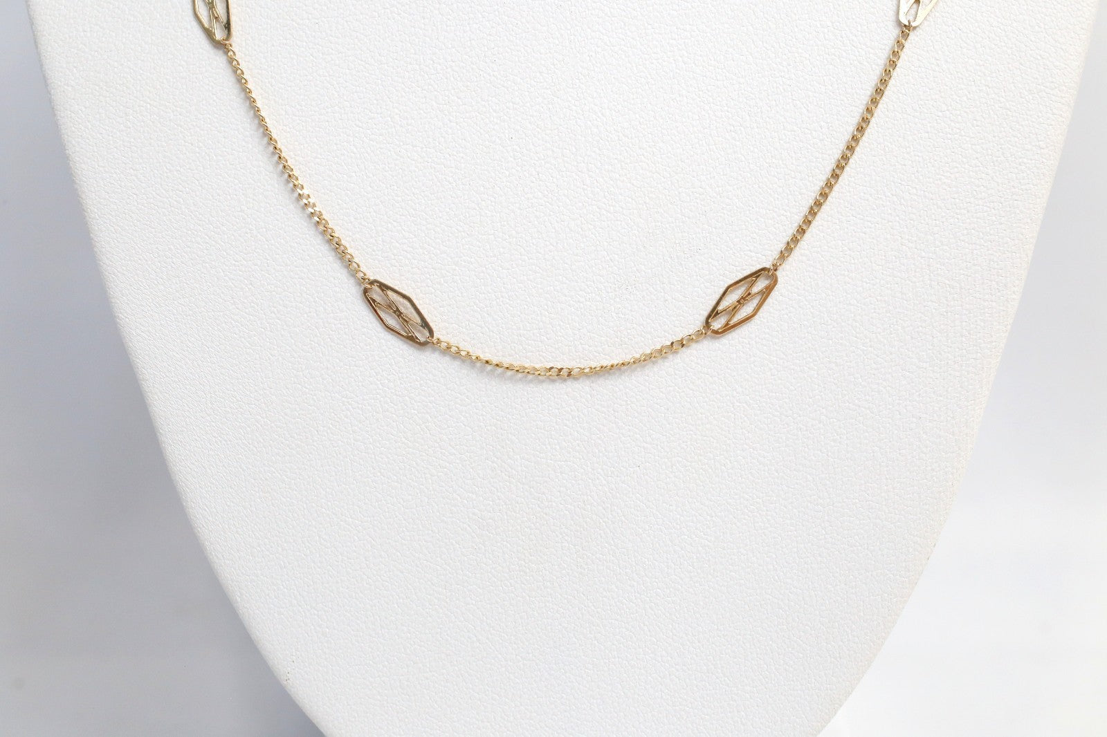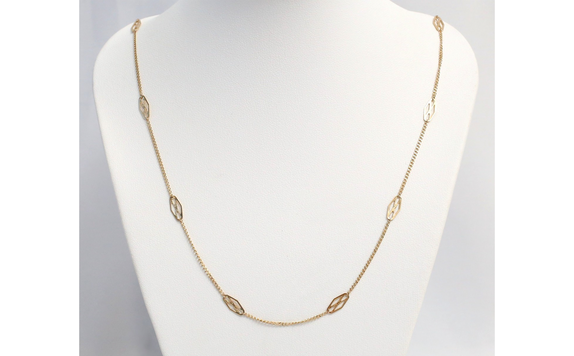 Elegant and lightweight, this 14K yellow gold necklace features a series of open marquise-shaped stations evenly spaced along a fine gold chain. The modern, geometric design adds subtle dimension and movement, making it perfect for layering or wearing as a minimalist statement on its own. With its refined simplicity and timeless appeal, this piece offers everyday luxury with effortless style.