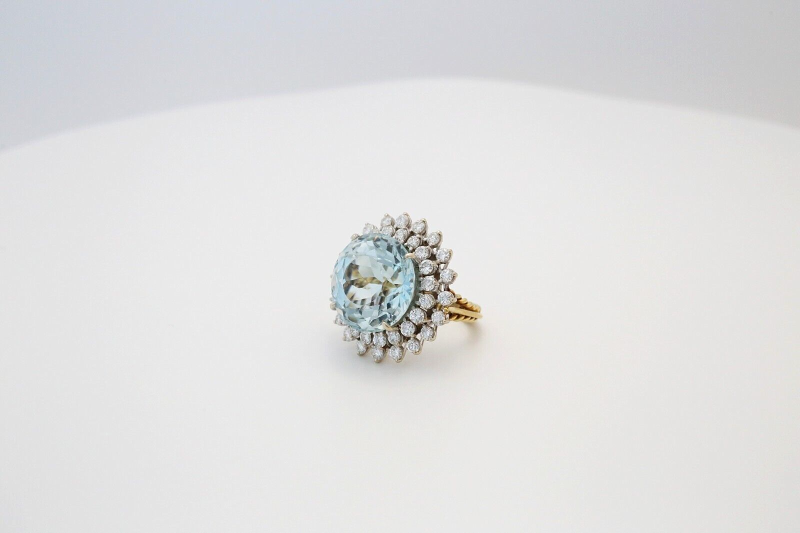 This stunning 18k gold ring showcases an exquisite design centered around a magnificent approximately 26-carat aquamarine gemstone. The large, round-cut aquamarine sparkles with a delicate icy-blue hue, creating a captivating focal point. Surrounding the aquamarine is a double halo of brilliant-cut diamonds, each meticulously set to enhance the ring’s brilliance and add a luxurious radiance. The diamonds, set in a 14k white gold prong setting for a sturdier hold, create a dazzling contrast against the aquamarine, further amplifying its natural beauty. The intricate gallery and twisted gold shank, crafted from 18k yellow gold, provide structural elegance and durability. This striking statement ring effortlessly blends vintage charm with timeless sophistication, making it a perfect choice for collectors and fine jewelry enthusiasts.