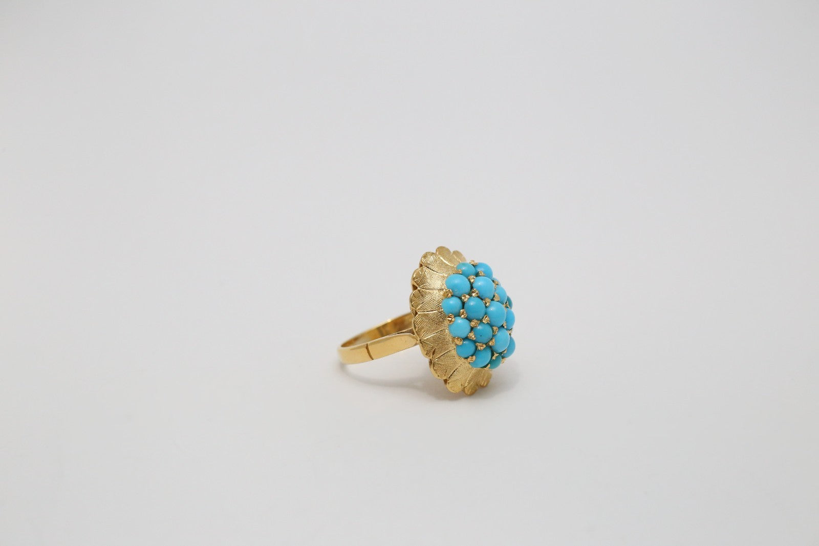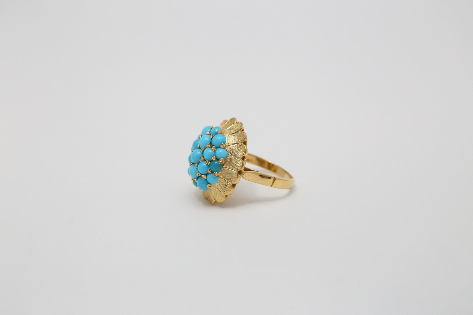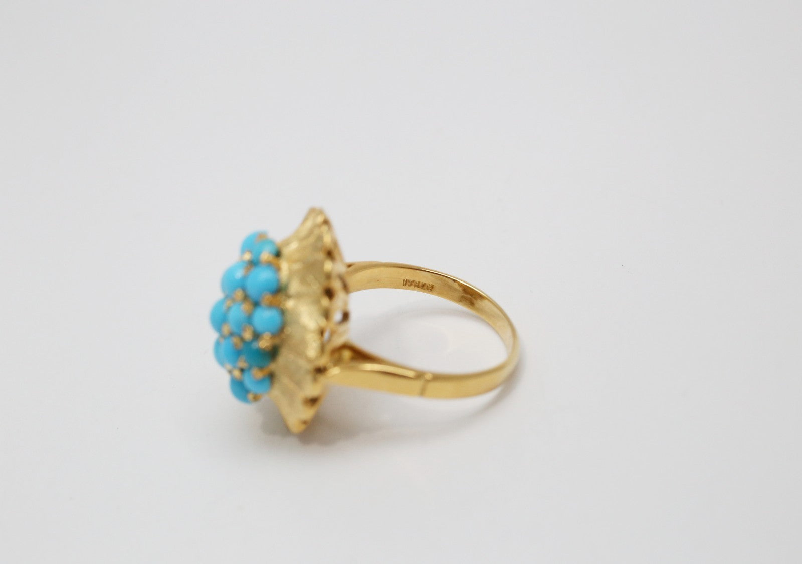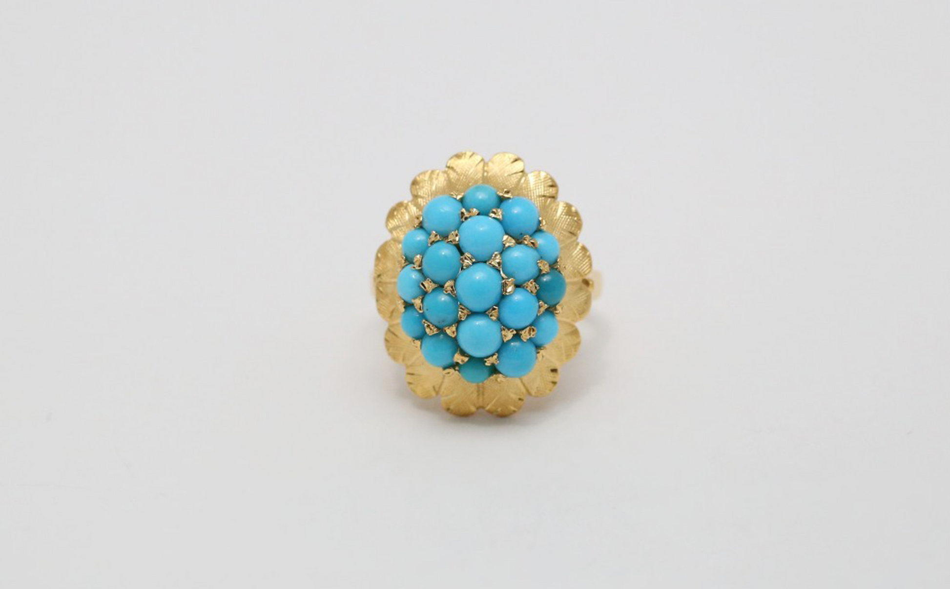 This vintage-style ring features a bold, oval-shaped cluster of vibrant round cabochons, elegantly arranged. The setting is crafted in warm-toned metal with a textured, scalloped border that adds dimension and a classic touch. The raised cluster design gives the ring a domed profile, making it a standout piece that blends intricate craftsmanship with timeless elegance.