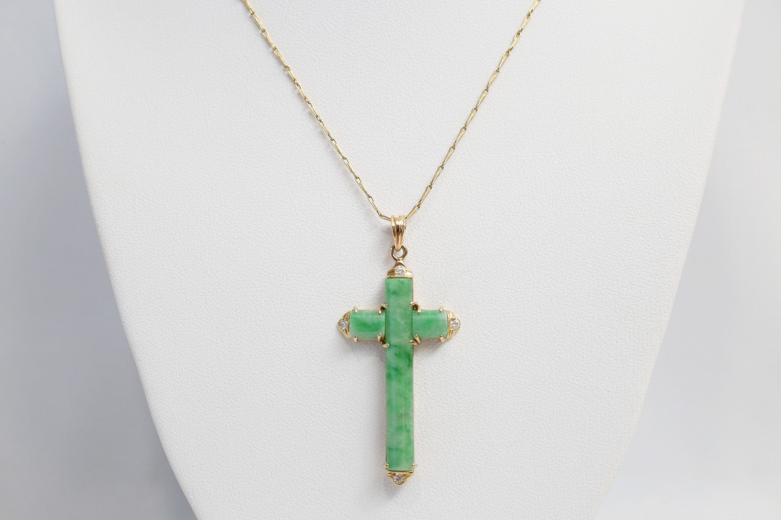 18k Yellow Gold Green Jade Cross Pendant Necklace, 18 inches - 8.1g