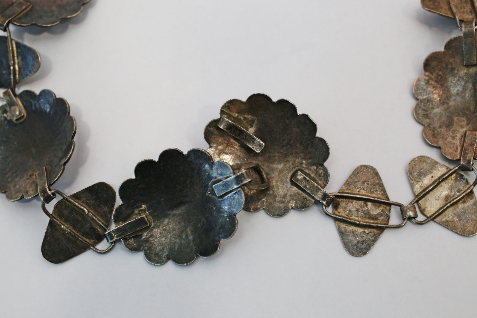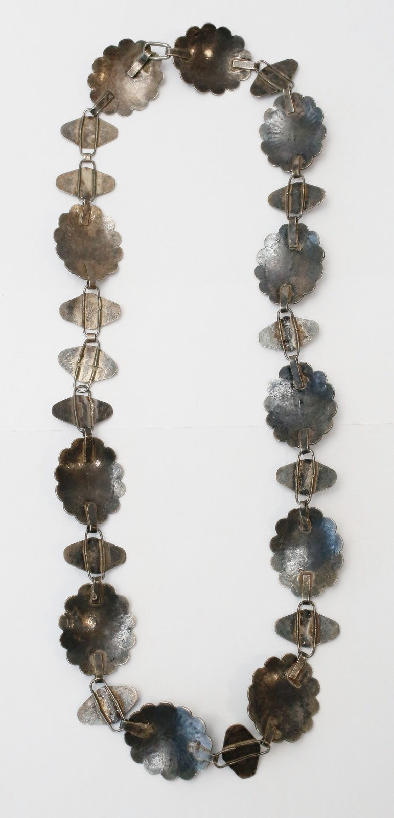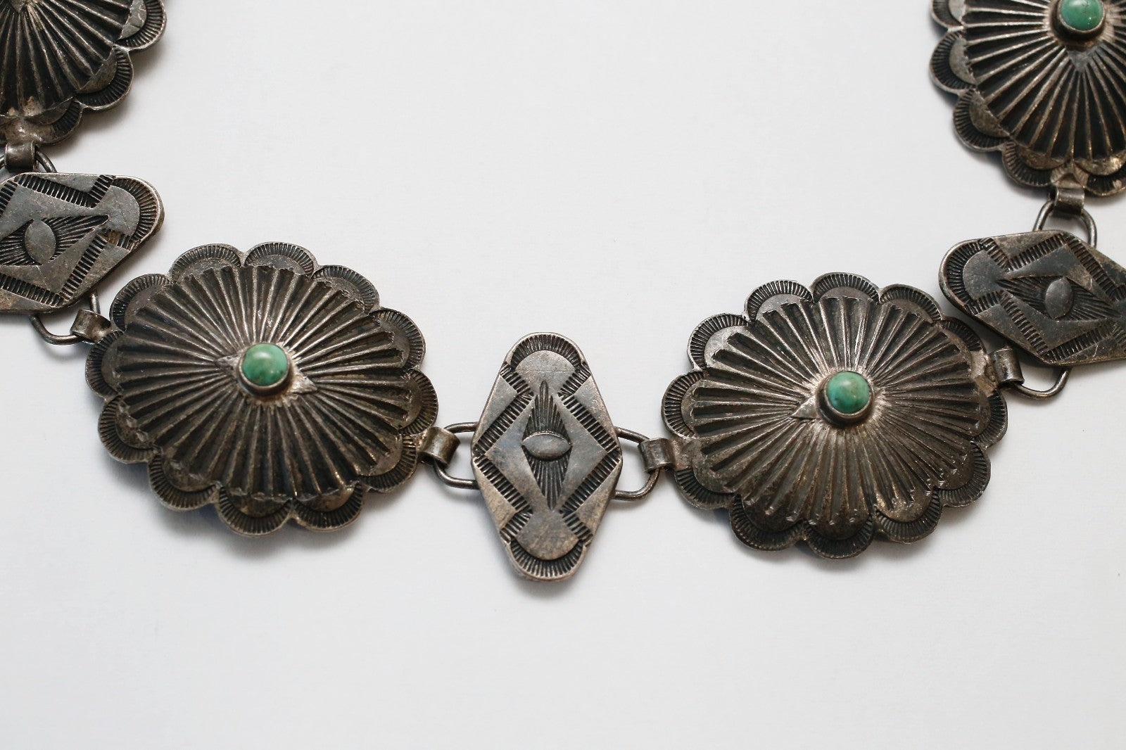 This bold antique sterling silver necklace features a striking Southwestern-style design, showcasing large concho-style links with radiating stamped patterns and centered turquoise cabochons. Each domed concho is connected by hand-formed sterling links bearing abstract, possibly symbolic motifs, creating a continuous and rhythmic visual flow. The necklace has a substantial presence, both in scale and craftsmanship, with an oxidized finish that enhances its dimensional detail.
