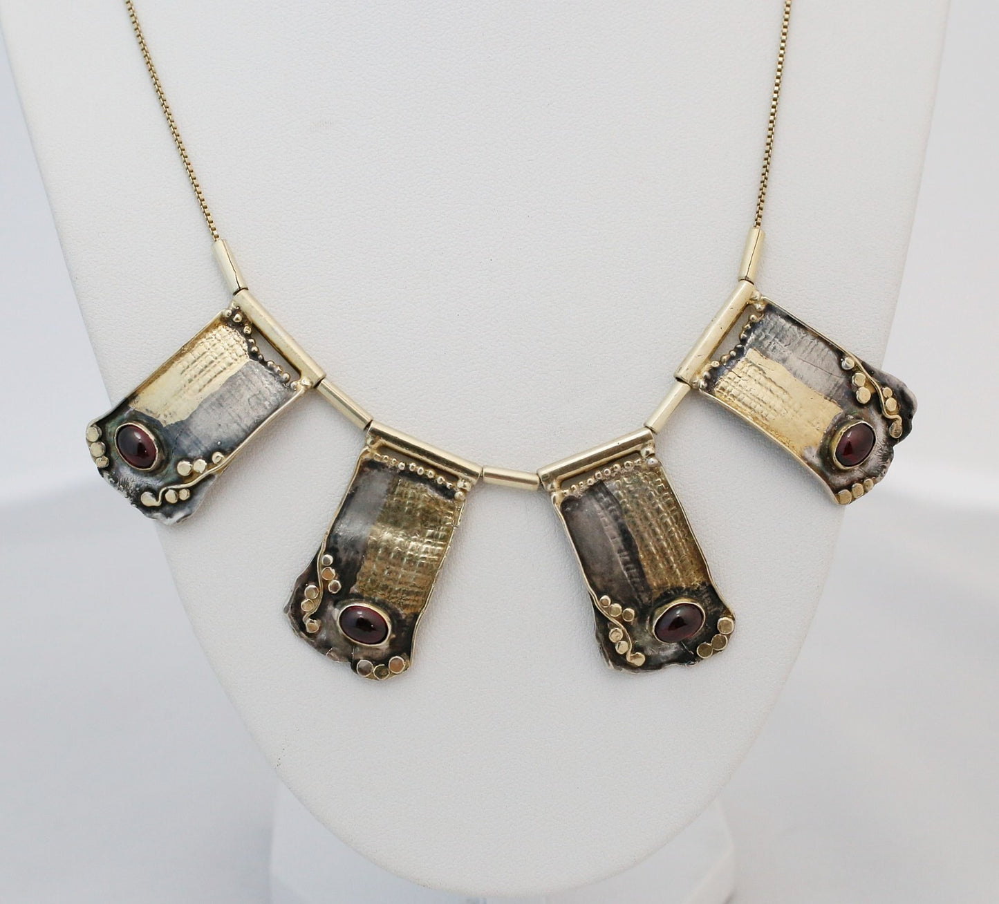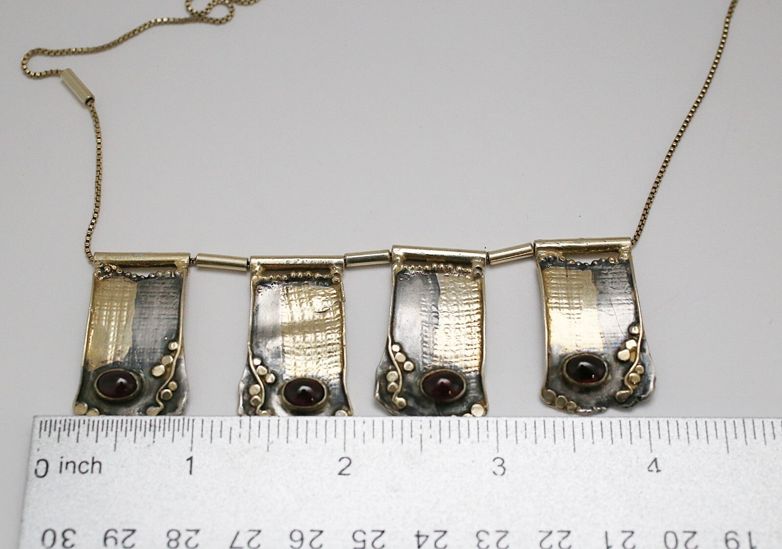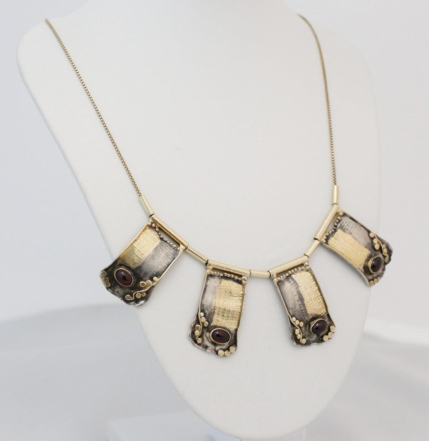 This artisan-crafted sterling silver necklace features five textured, rectangular panels adorned with gold detailing and deep garnet cabochons. Bold and sculptural, it is signed and showcases an oxidized finish with handcrafted character, combining modernist design and earthy elegance.