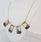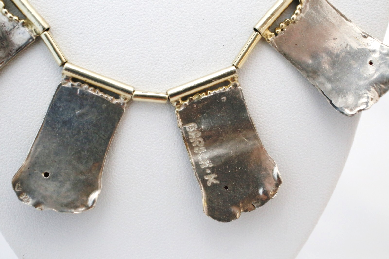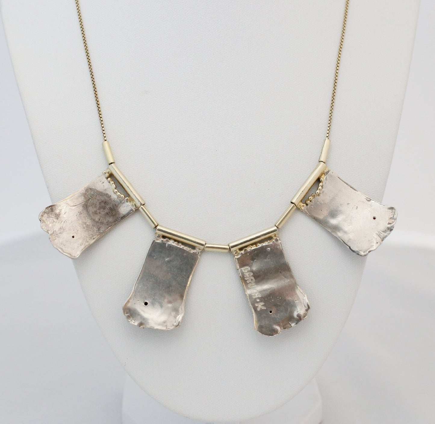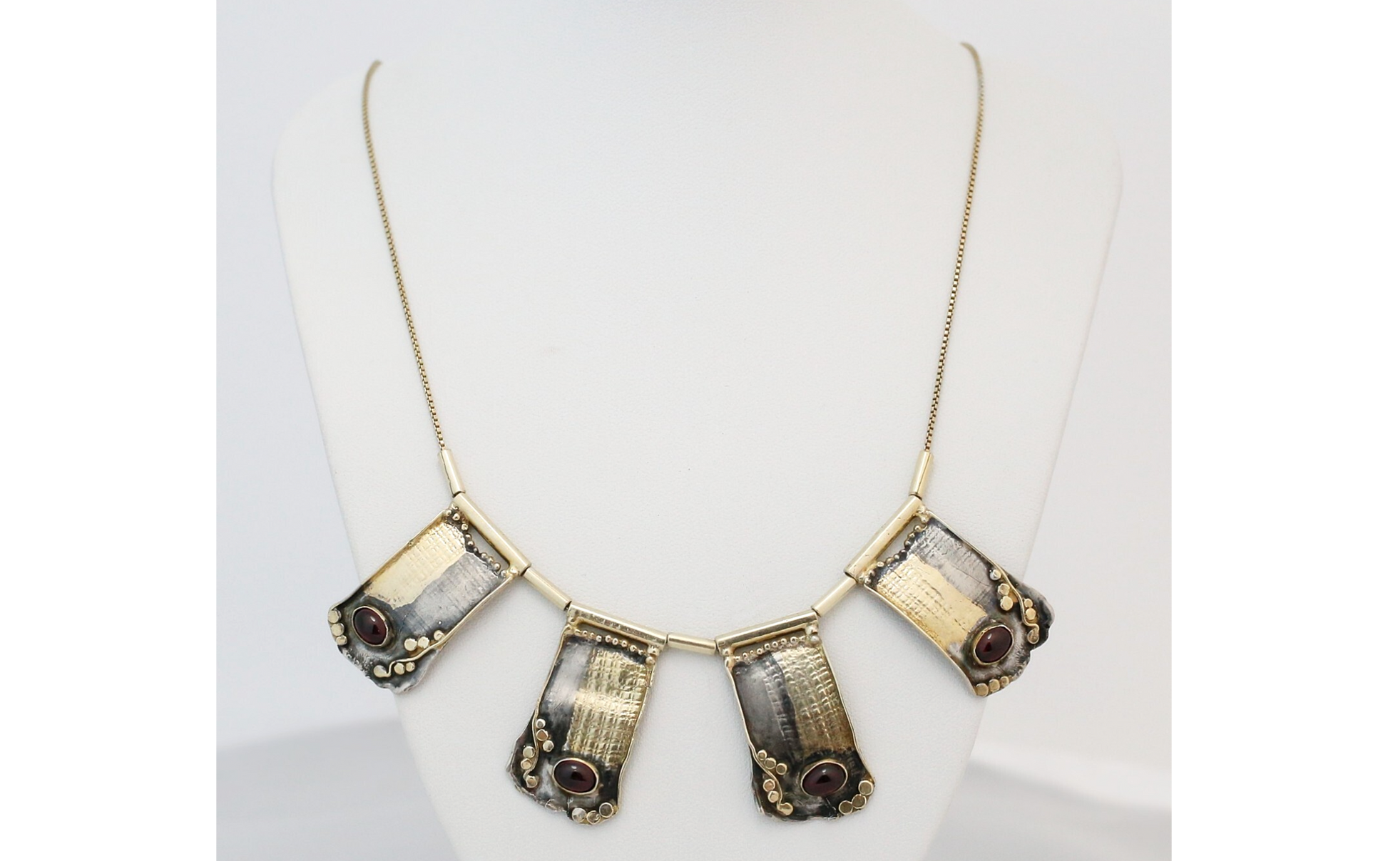 This artisan-crafted sterling silver necklace features five textured, rectangular panels adorned with gold detailing and deep garnet cabochons. Bold and sculptural, it is signed and showcases an oxidized finish with handcrafted character, combining modernist design and earthy elegance.