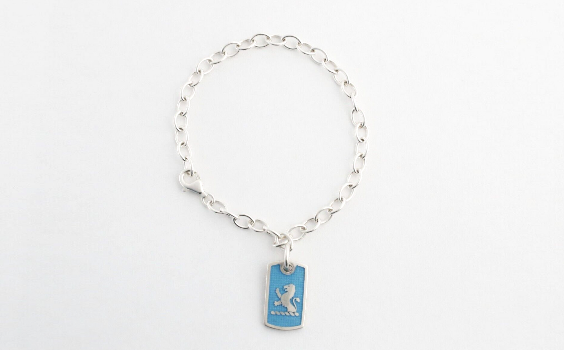 This Birks sterling silver bracelet features a bold, oval-link chain paired with a rectangular charm showcasing a silver lion rampant against a soft blue enamel background. The heraldic design evokes strength and heritage, while the vibrant enamel adds a fresh, modern touch to this elegant and timeless accessory.
