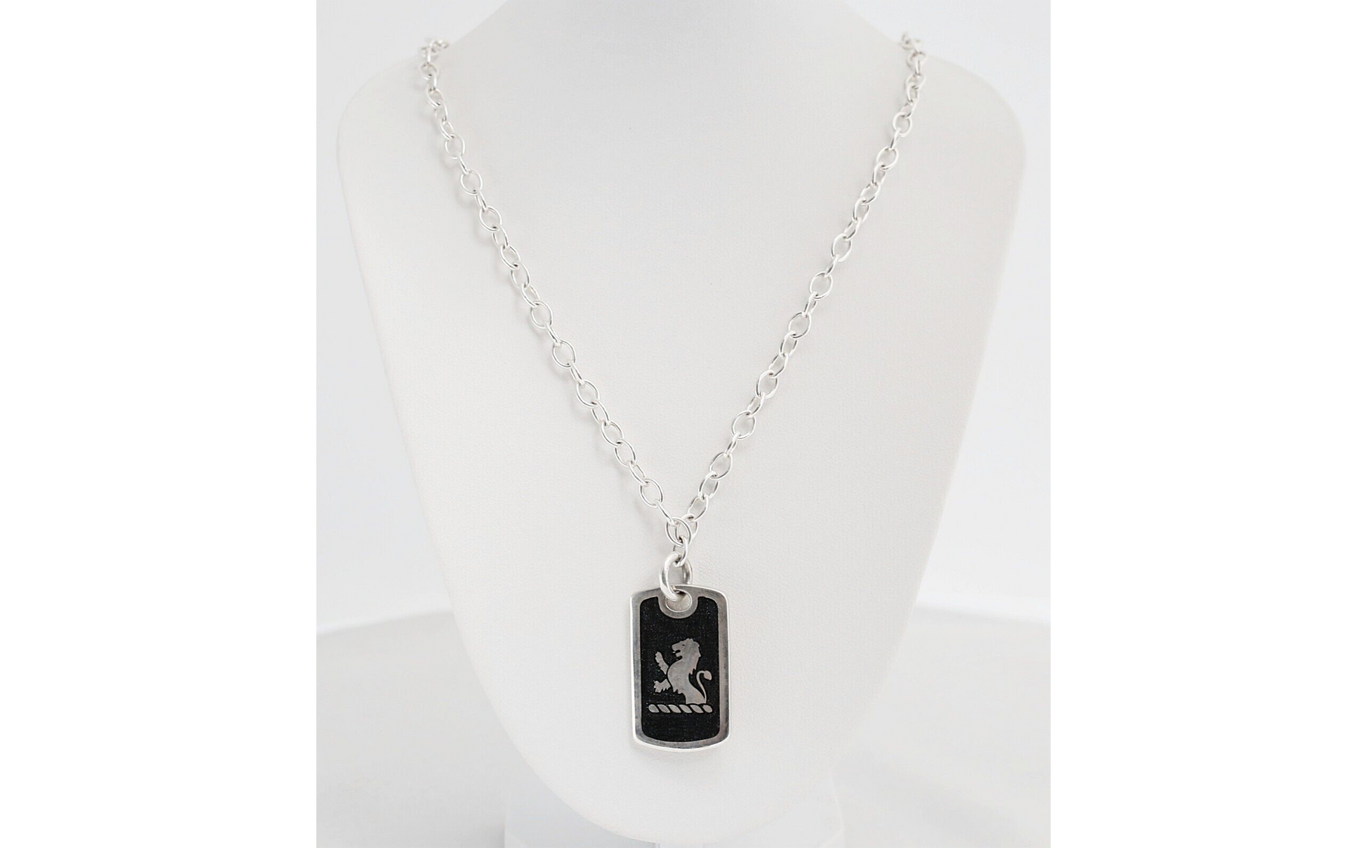 This vintage Birks necklace features a bold sterling silver chain and a rectangular pendant etched with a lion rampant, a classic heraldic symbol of courage and nobility. Set against a blackened background for contrast, the design evokes timeless strength and elegance, embodying Birks’ tradition of refined, heritage-inspired craftsmanship.