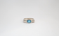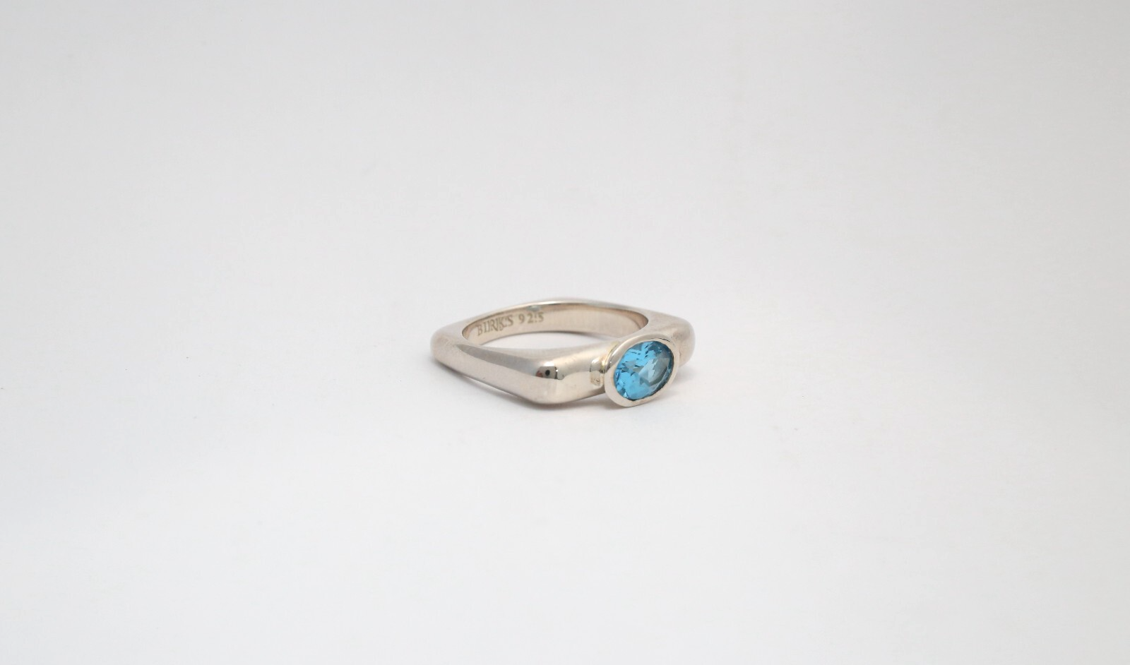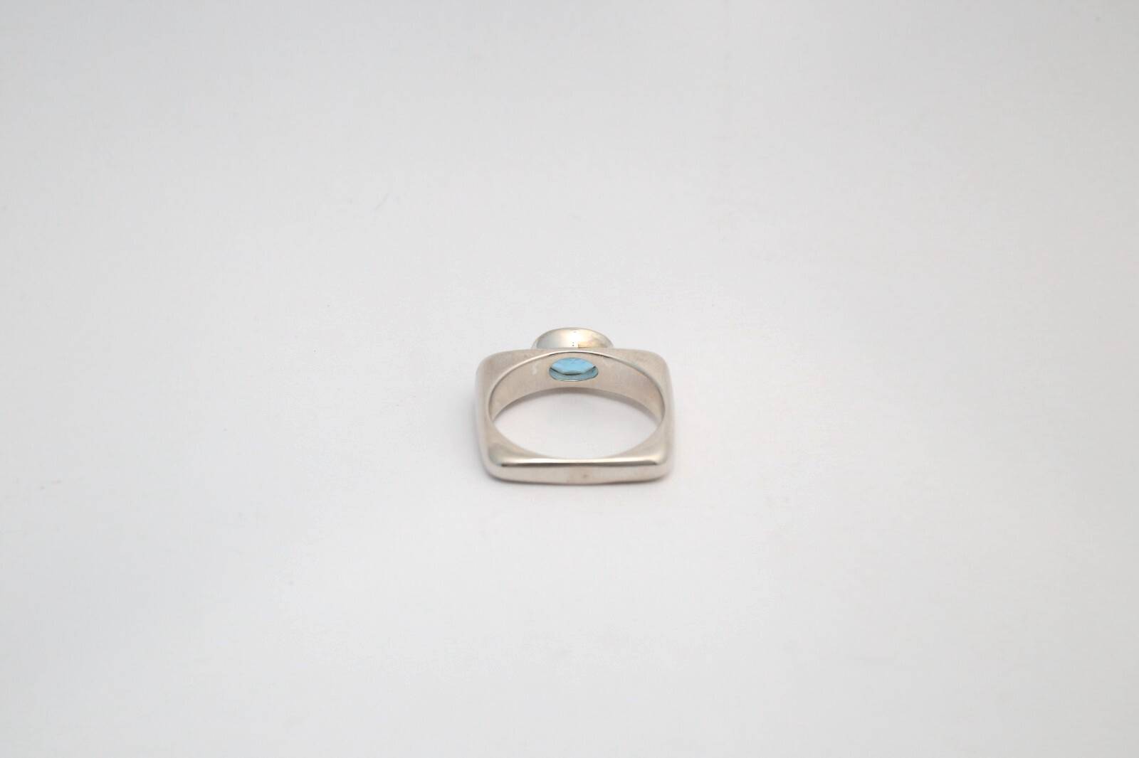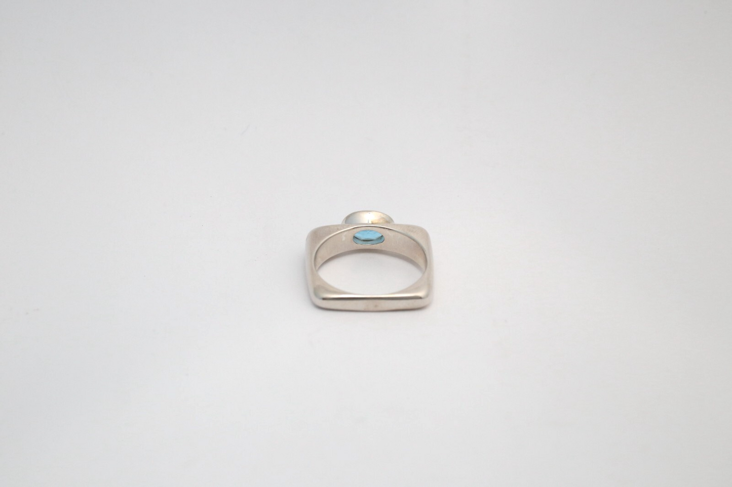 This lovely squared ring is crafted in sterling silver and features a bezel set gemstone.