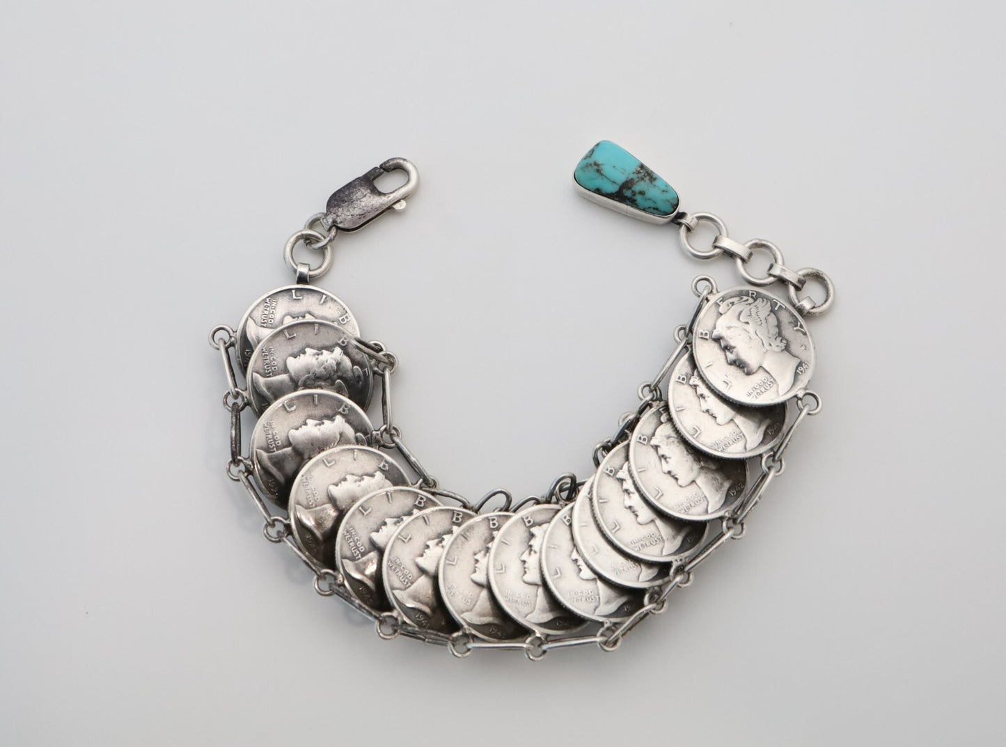 This handcrafted sterling silver bracelet features a triple-row design of authentic Mercury dimes, intricately linked to form a bold, cuff-style piece. Hallmarked JMC Navajo for artisan James McCabe, it reflects traditional Navajo silversmithing. A natural turquoise accent adds a classic Southwestern finish to this striking, collectible statement accessory.