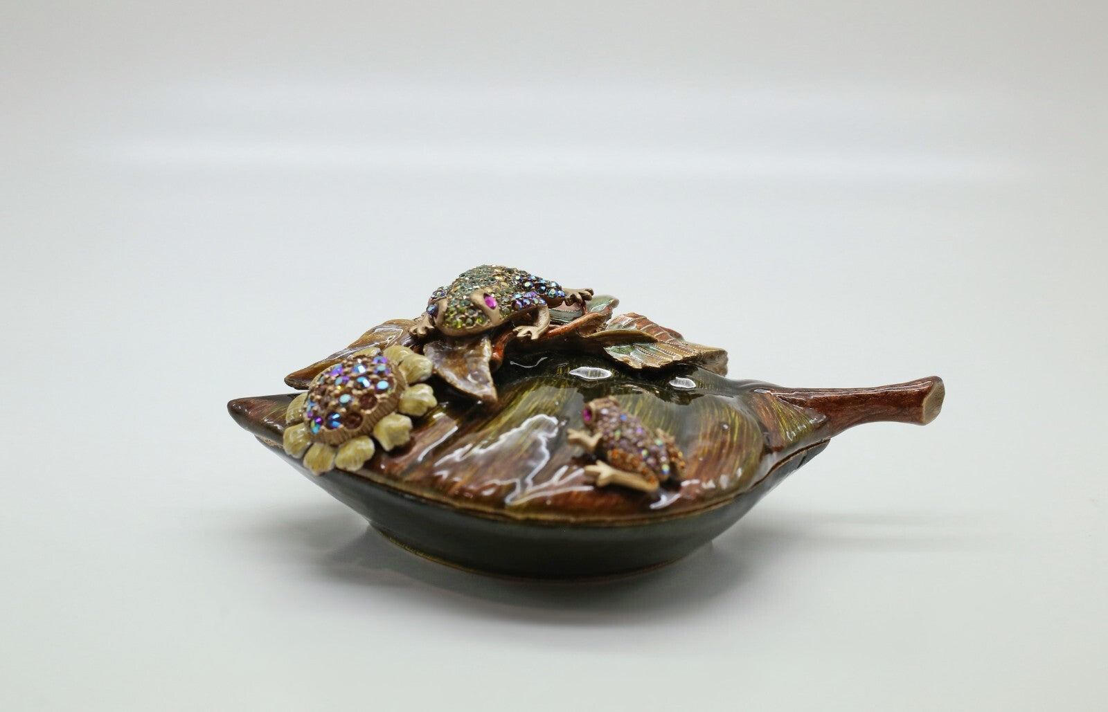 This lovely Jay Strongwater trinket box showcases a nature-inspired design with a crystal accented frog resting atop a sculpted leaf, accompanied by a smaller frog detail below. Finished with hand-applied enamel in layered earth tones and adorned with Swarovski crystals, the piece offers rich texture and dimensions. The lift top leaf opens to a smooth interior compartment, combining visual appeal with functionality.