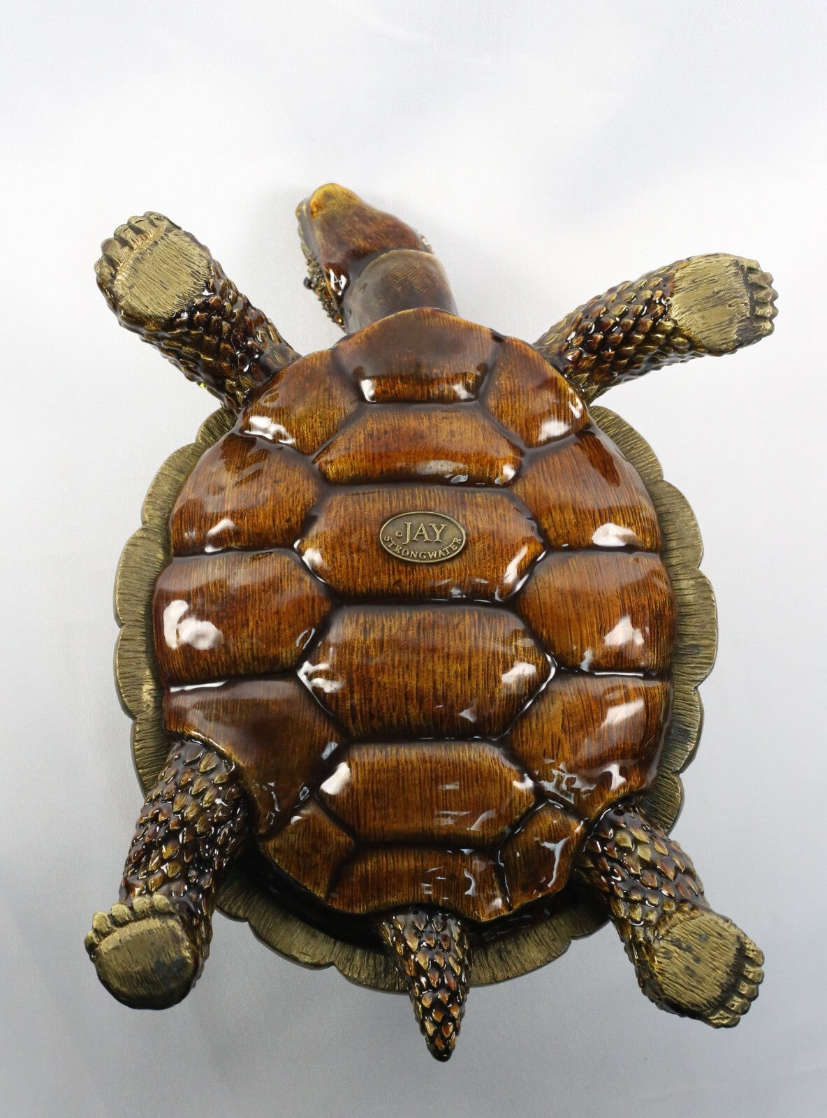 This lovely Jay Strongwater turtle trinket box showcases intricate enamel work and precision-set Swarovski crystals across a dimensional, sculpted form. The shell is designed with geometric panels in rich green hues, accented by multi-toned stones that add depth and brilliance. The lift top opens open to a smooth interior compartment, offering both beauty and function. Detailed texturing along the head and limbs enhances the lifelike quality of this piece.