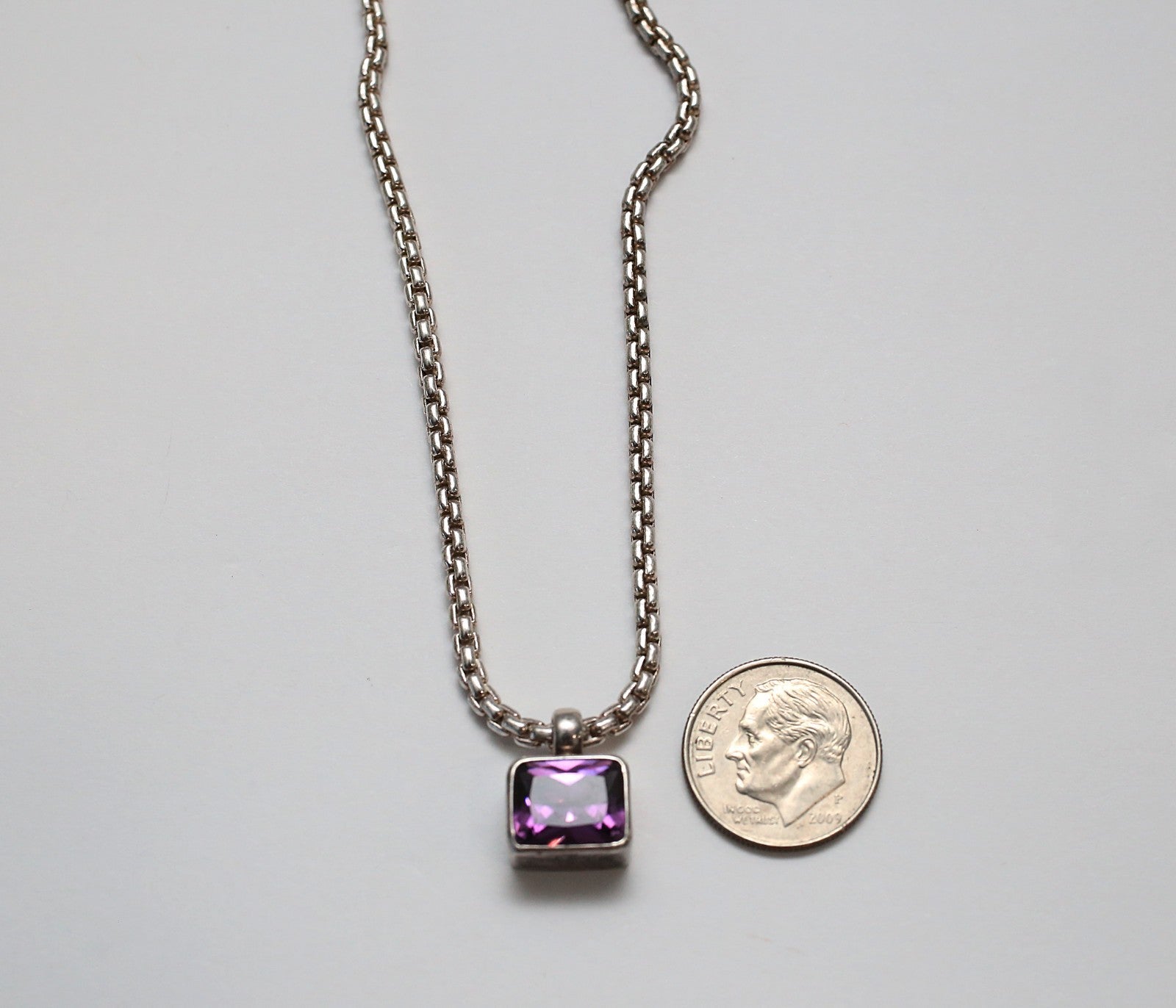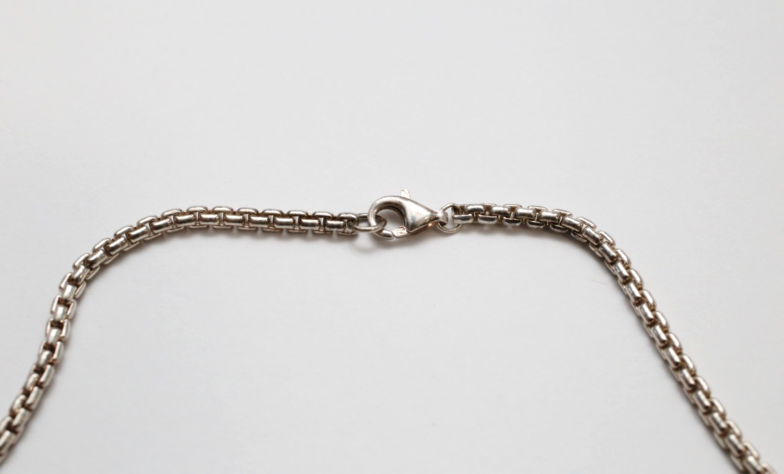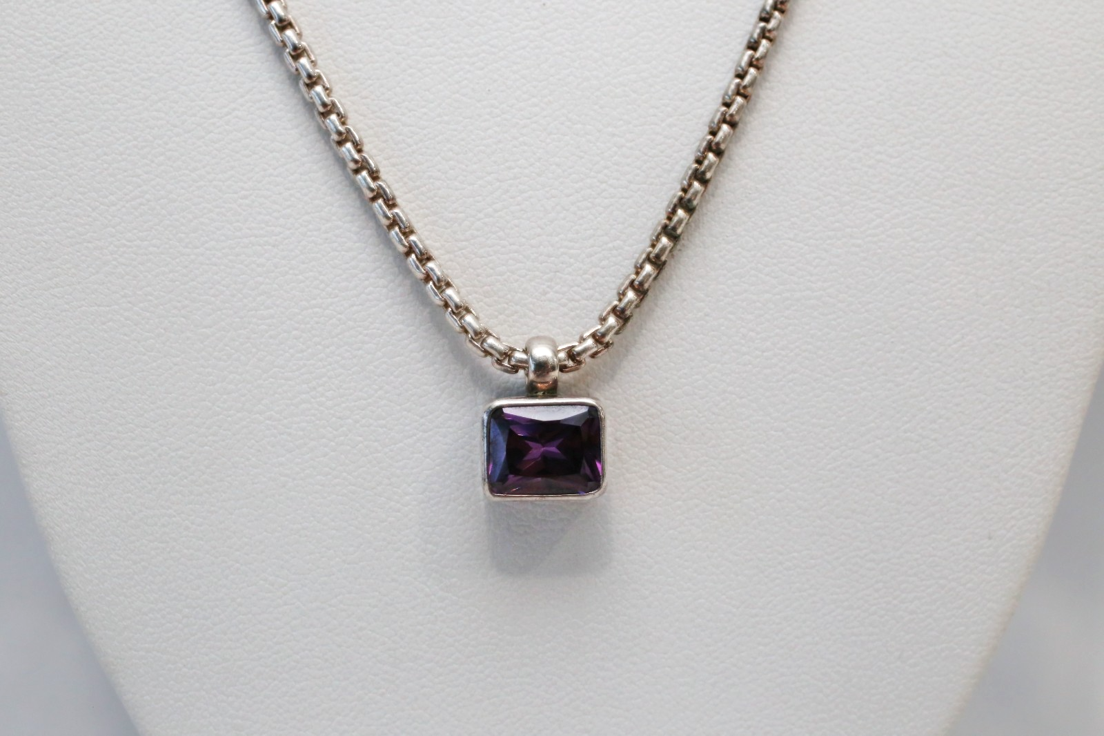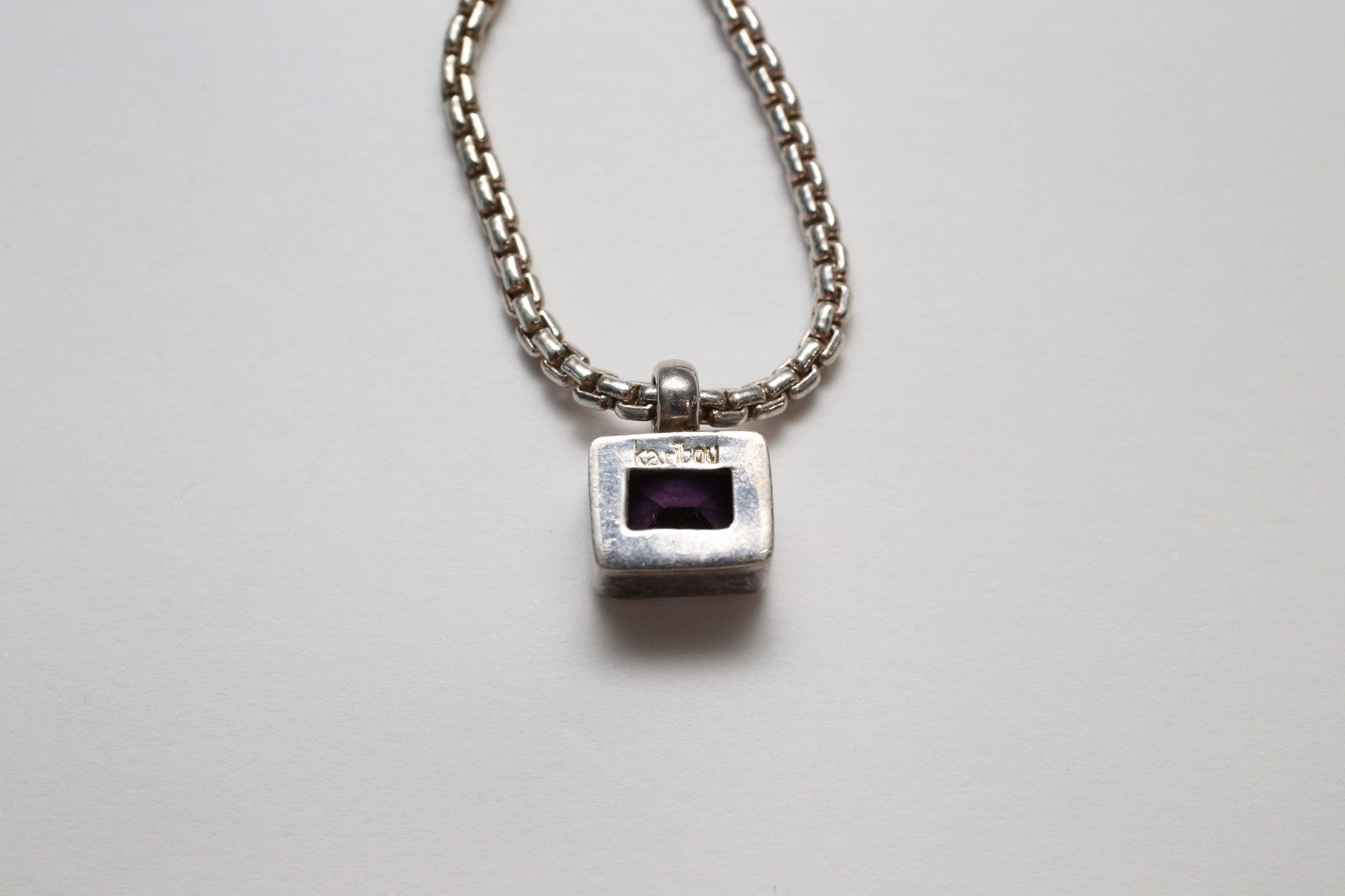This Karibou sterling silver necklace features a bold, modern box chain paired with a sleek bezel-set pendant. Its clean lines and structured design offer a contemporary yet timeless aesthetic.