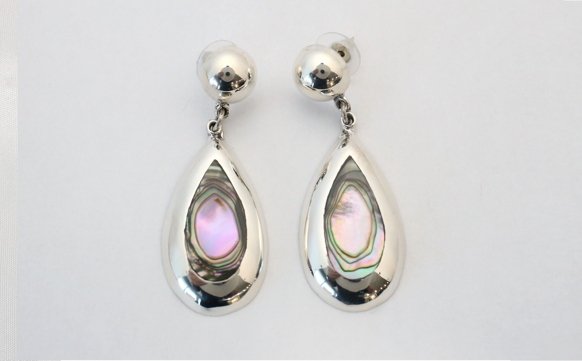 These elegant Mexican sterling silver post-back dangle earrings featuring a bold teardrop design with iridescent abalone shell inlay. The polished silver finish and fluid lines create a striking contrast, offering both movement and luminous color in every angle.