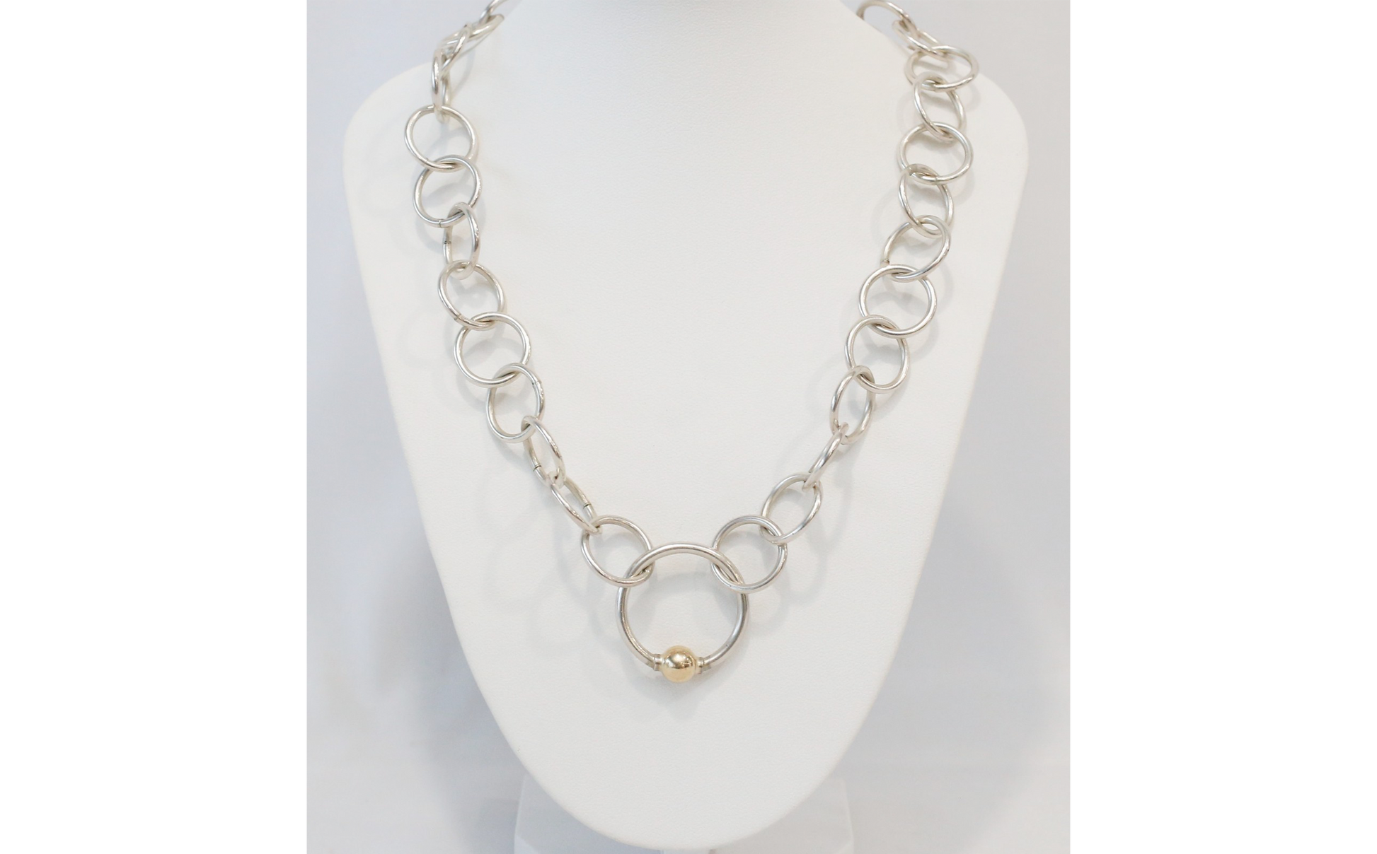 This contemporary necklace features interlocking sterling silver rings, creating a bold, sculptural chain design. The piece is accented with 14k gold end caps on the toggle clasp, adding a warm contrast and touch of luxury. Its minimalist form and mixed-metal detailing make it a versatile statement accessory with modern elegance.