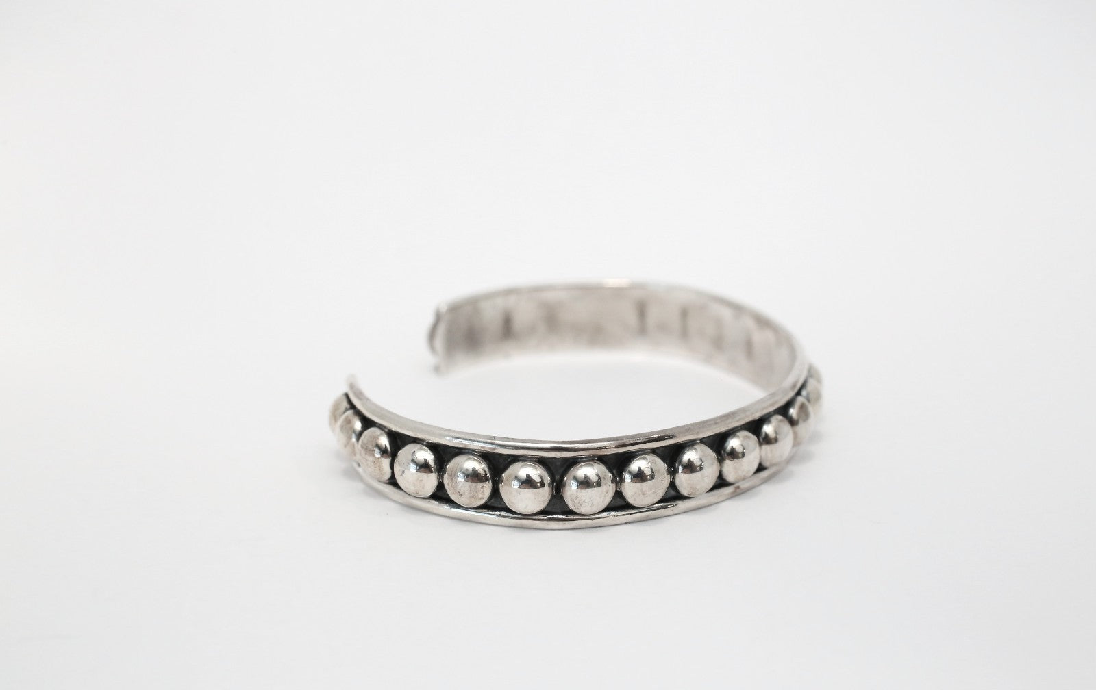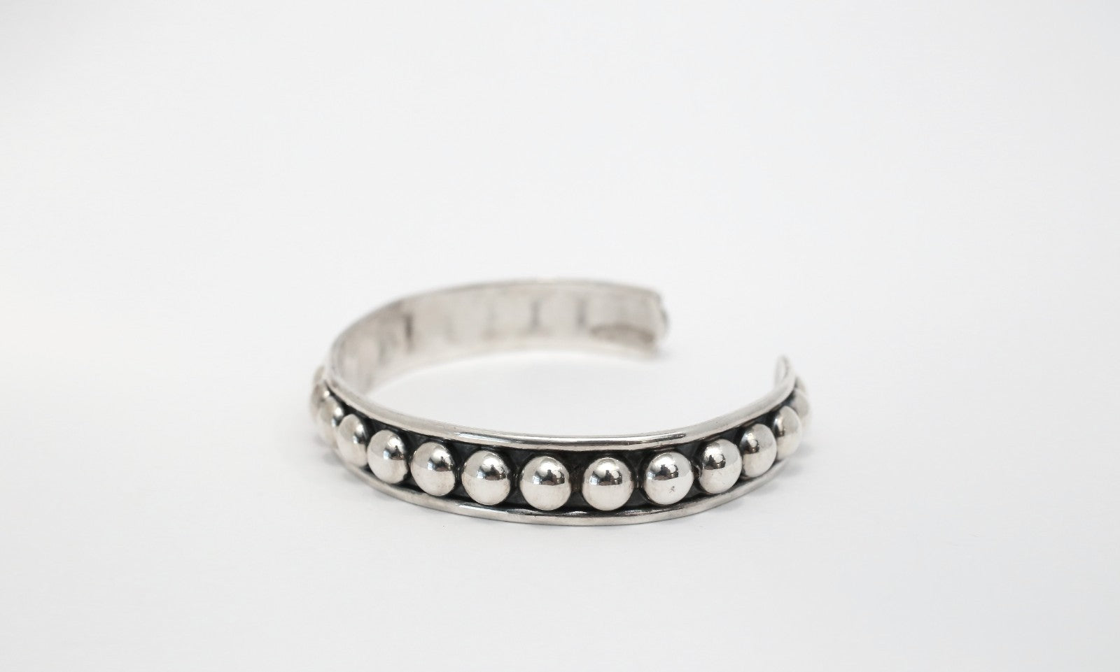 This sterling silver cuff bracelet features a bold, sculptural design with a row of polished silver domes across the top. The high-shine spheres create a dimensional, modern silhouette while echoing vintage silverwork influences. The open cuff style allows for an adjustable fit, making it both striking and wearable. Ideal for stacking or statement wear on its own.
