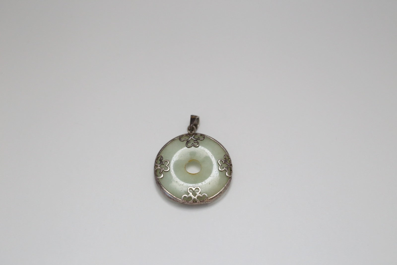 This pendant centers on a round pale green jade disc with a smooth finish, adorned by four sterling silver floral overlays. A timeless design that brings harmony and understated elegance to any necklace.