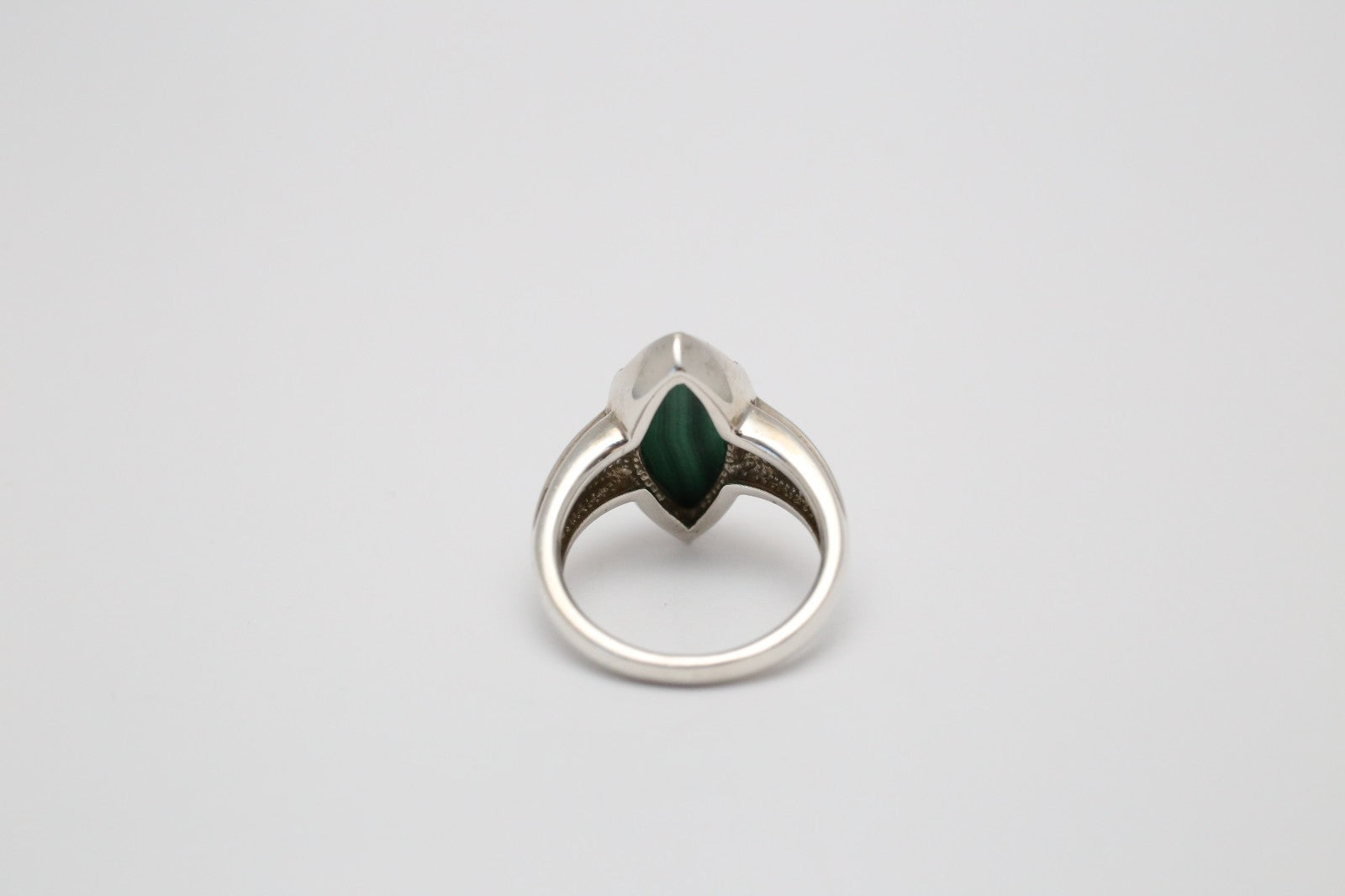 This sterling silver ring features a striking marquise-cut malachite cabochon, bezel-set in a sleek and modern setting. The malachite displays the rich, banded green patterns characteristic of the stone, with natural striping that adds depth and organic beauty. The split shank design enhances the stone’s elongated silhouette, giving the piece a balanced, elegant look.