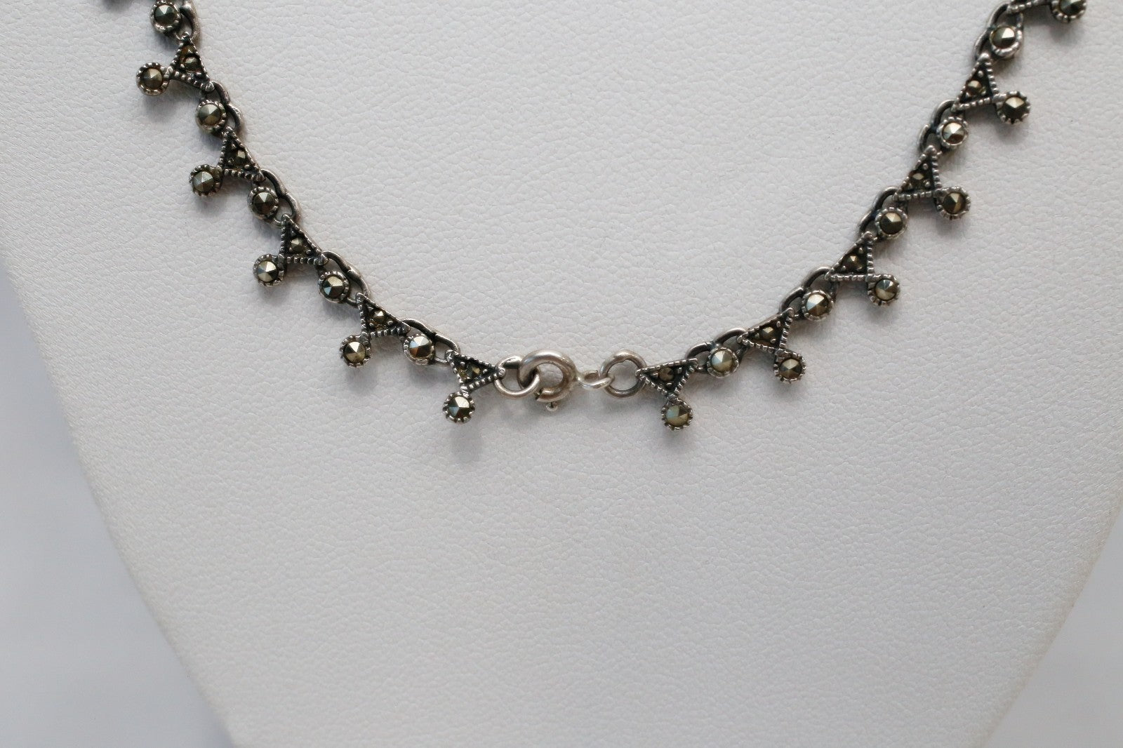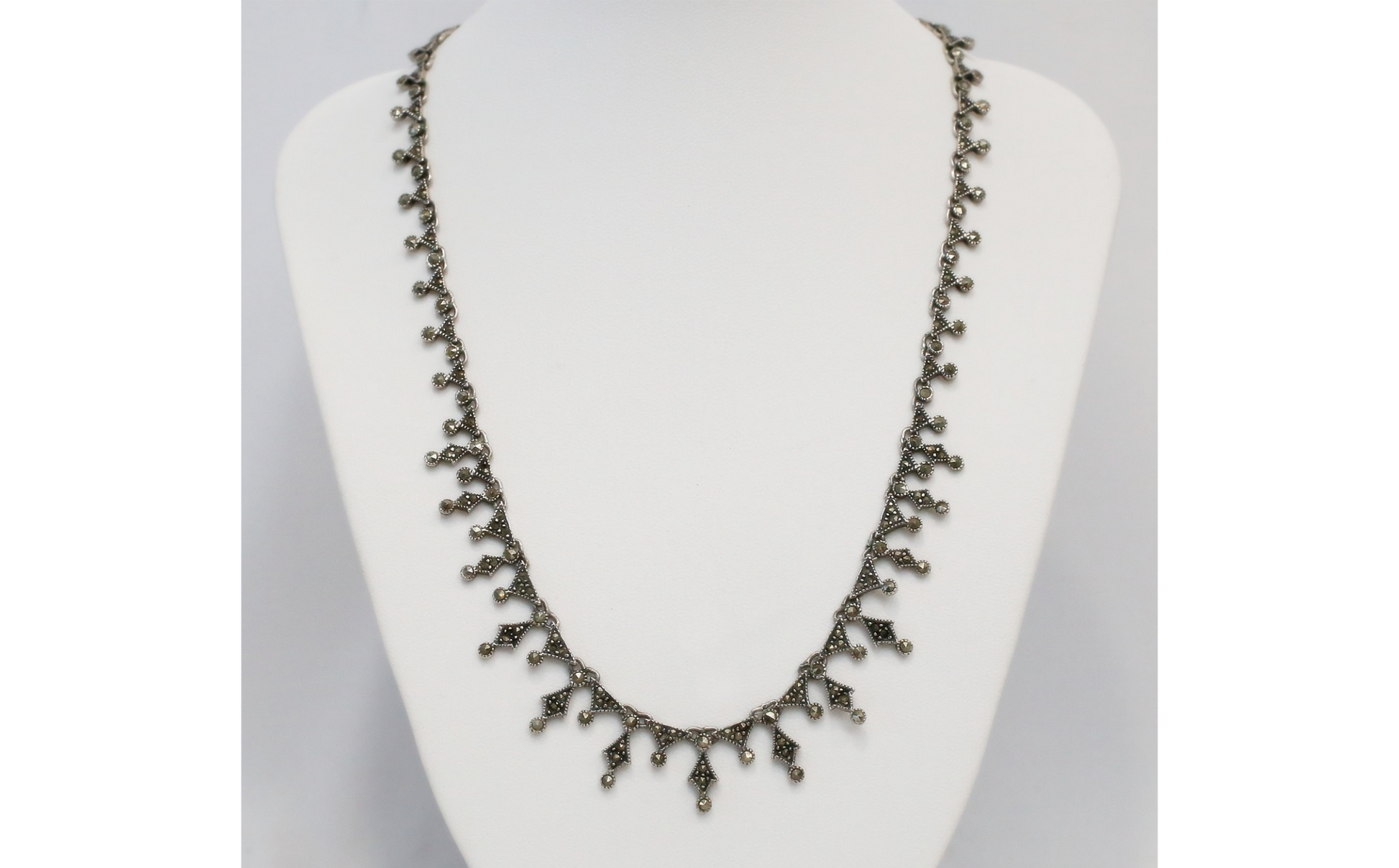 This vintage sterling silver necklace features an intricate, lace-like design with a repeating pattern of beaded drops and marcasite accents. Each segment is embellished with tiny, faceted marcasites that catch the light subtly against the oxidized silver backdrop.