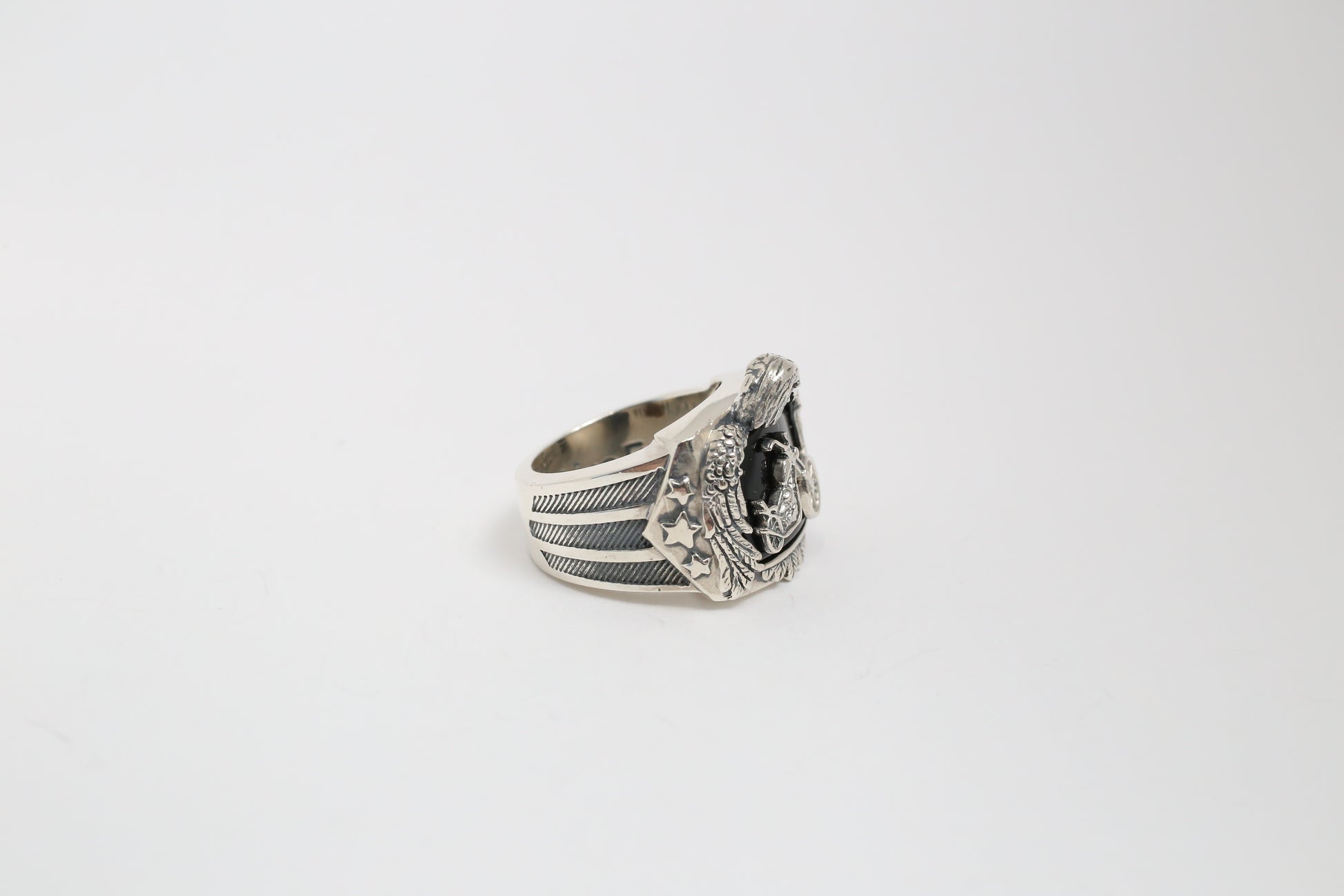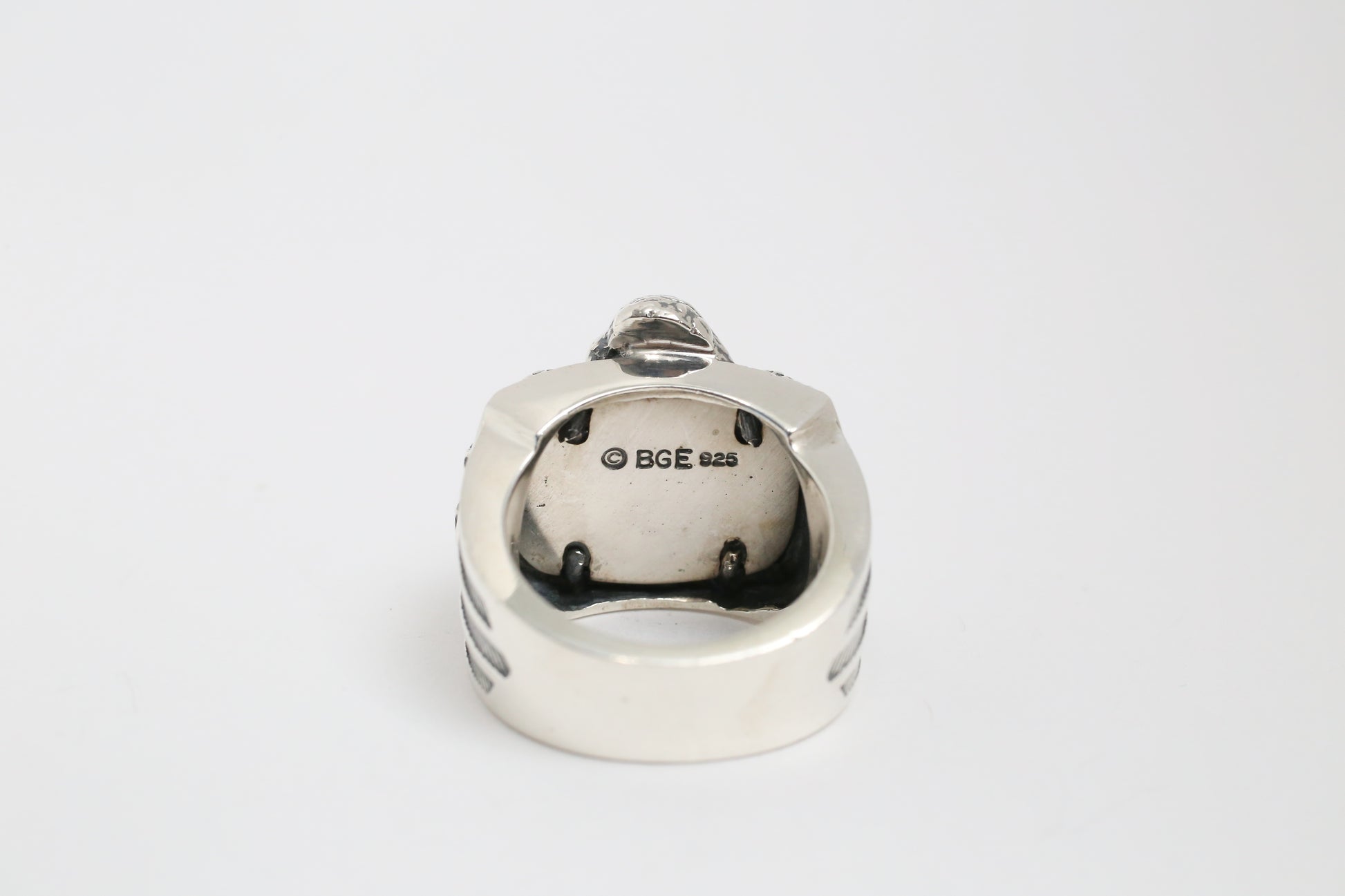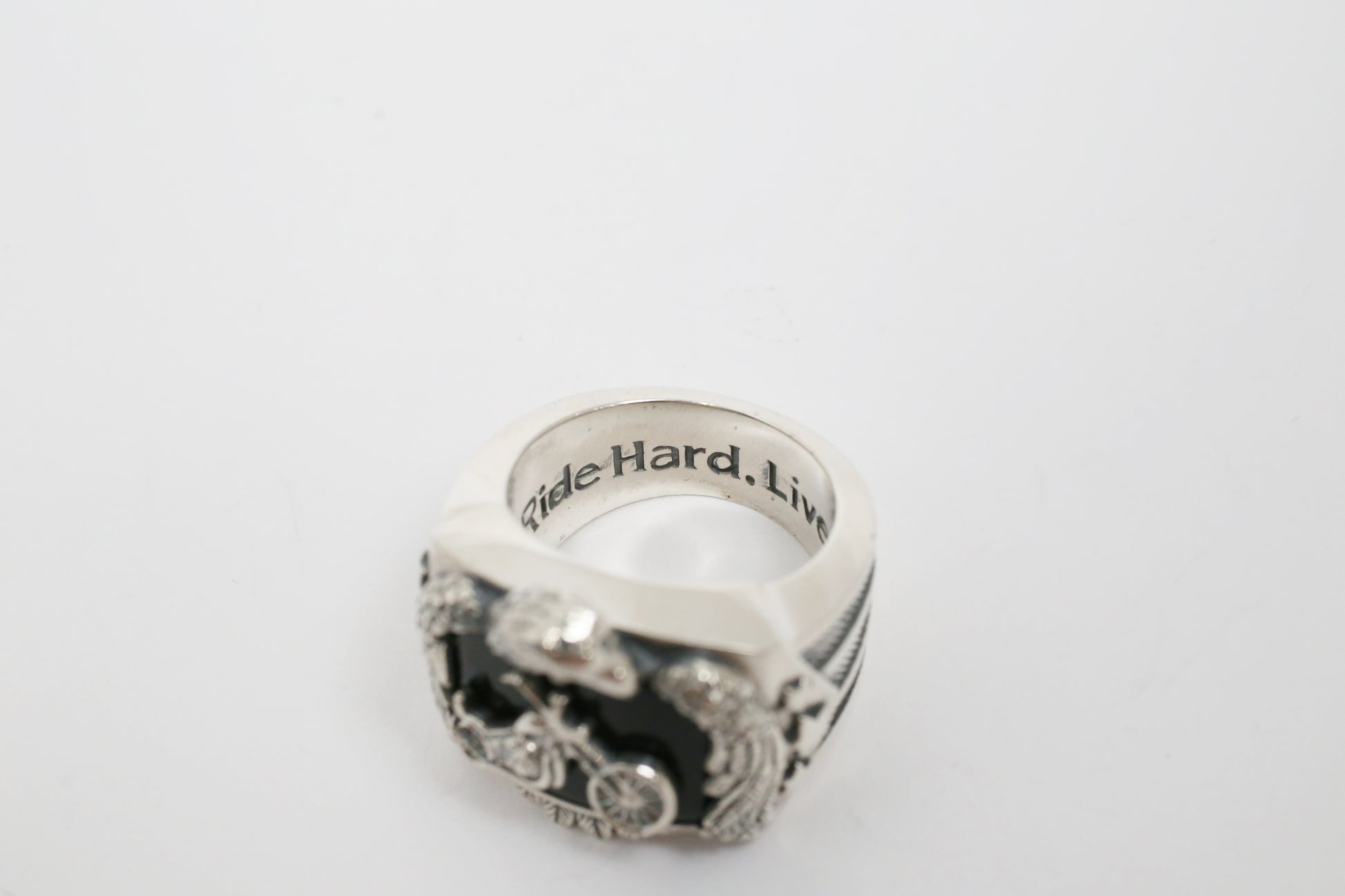 Crafted in solid sterling silver (.925), this bold biker ring showcases a raised motorcycle design set against a polished black background. An eagle head crowns the top, with detailed wings wrapping down the sides, accented by star motifs and textured striping. The interior is inscribed with “Ride Hard. Live Free,” embodying classic biker spirit. Marked BGE 925, this substantial statement piece celebrates freedom, strength, and the open road.