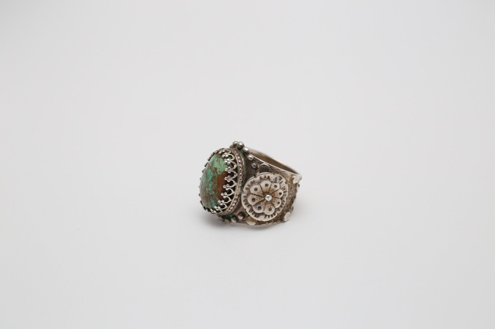 This striking sterling silver ring features an ornate and heavily textured band with intricate raised dot and floral motifs on each shoulder, flanking a large, bezel-set green turquoise stone. The face of the ring is defined by bold repoussé work and delicate twisted wire detailing that frames the stone, lending it a rugged, handcrafted aesthetic.