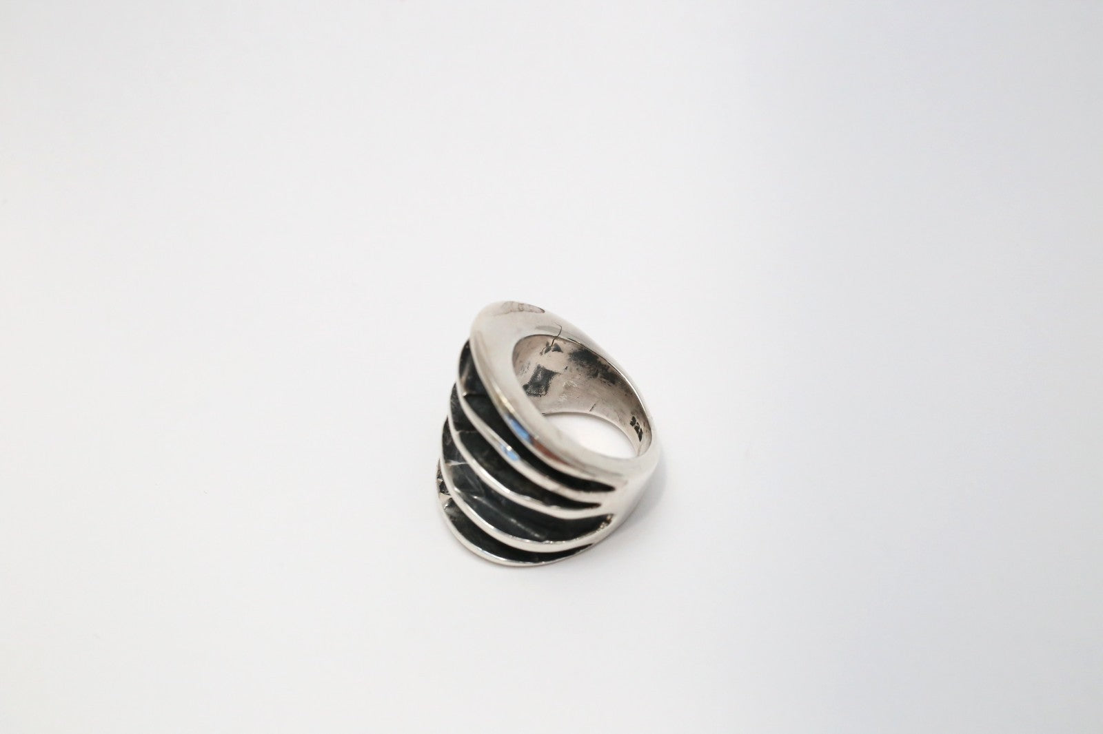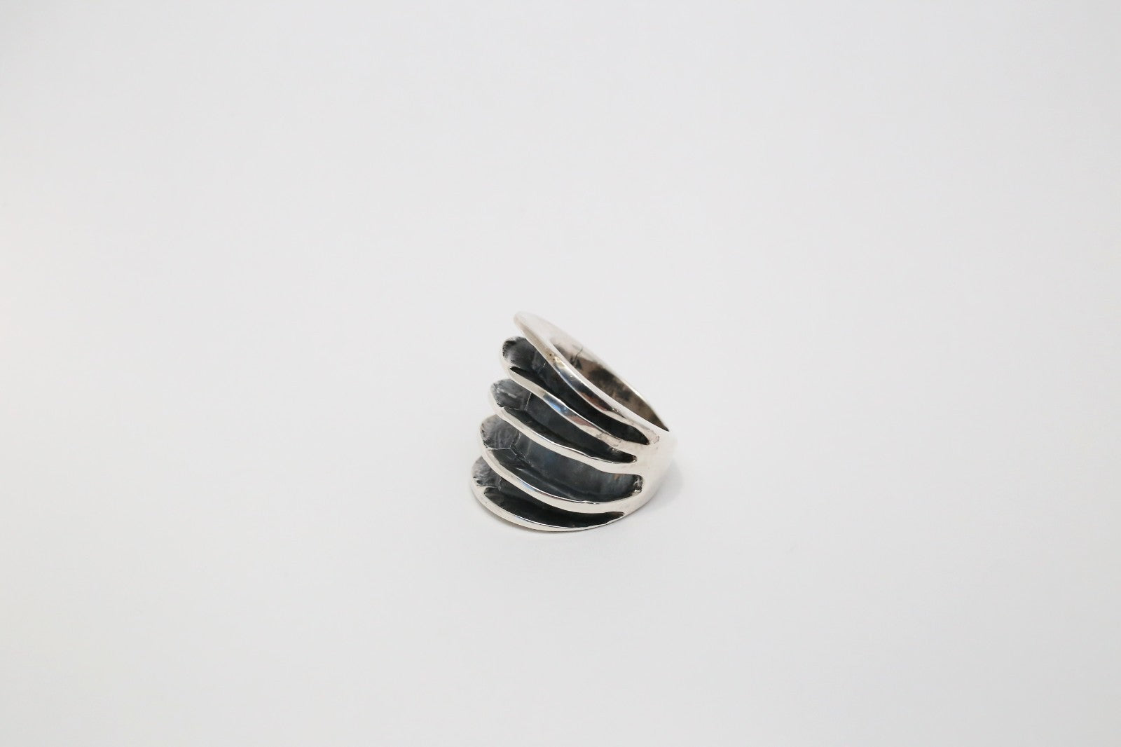 This bold sterling silver ring features a sculptural, stacked design with undulating, oxidized bands framed by polished edges. The layered form creates depth and movement, giving the piece a distinctly modern, almost architectural feel.