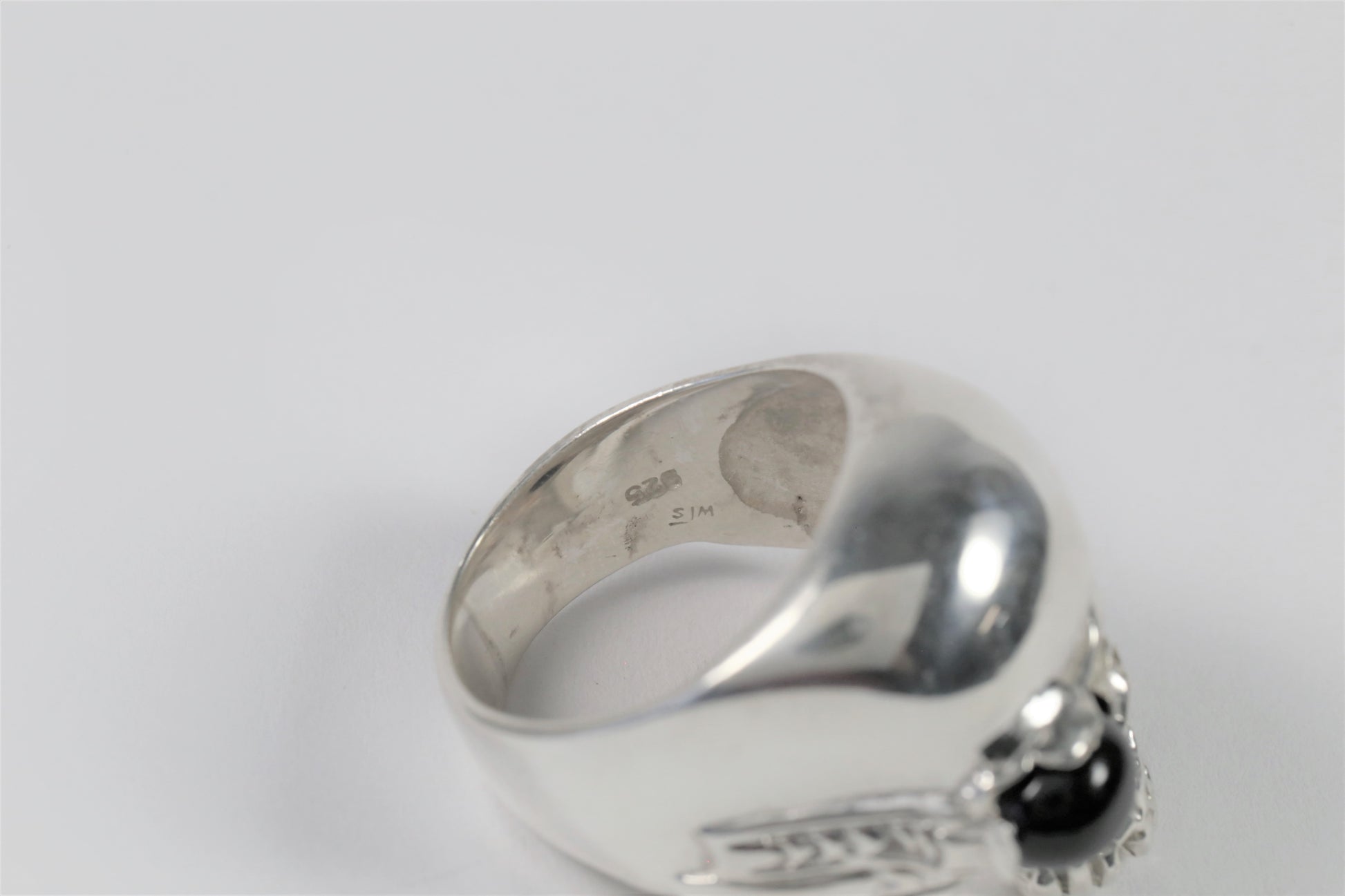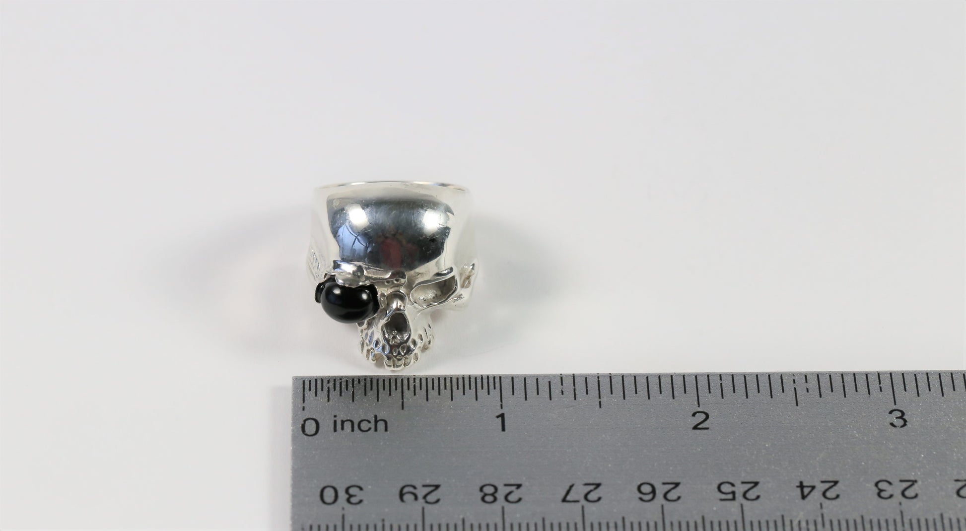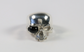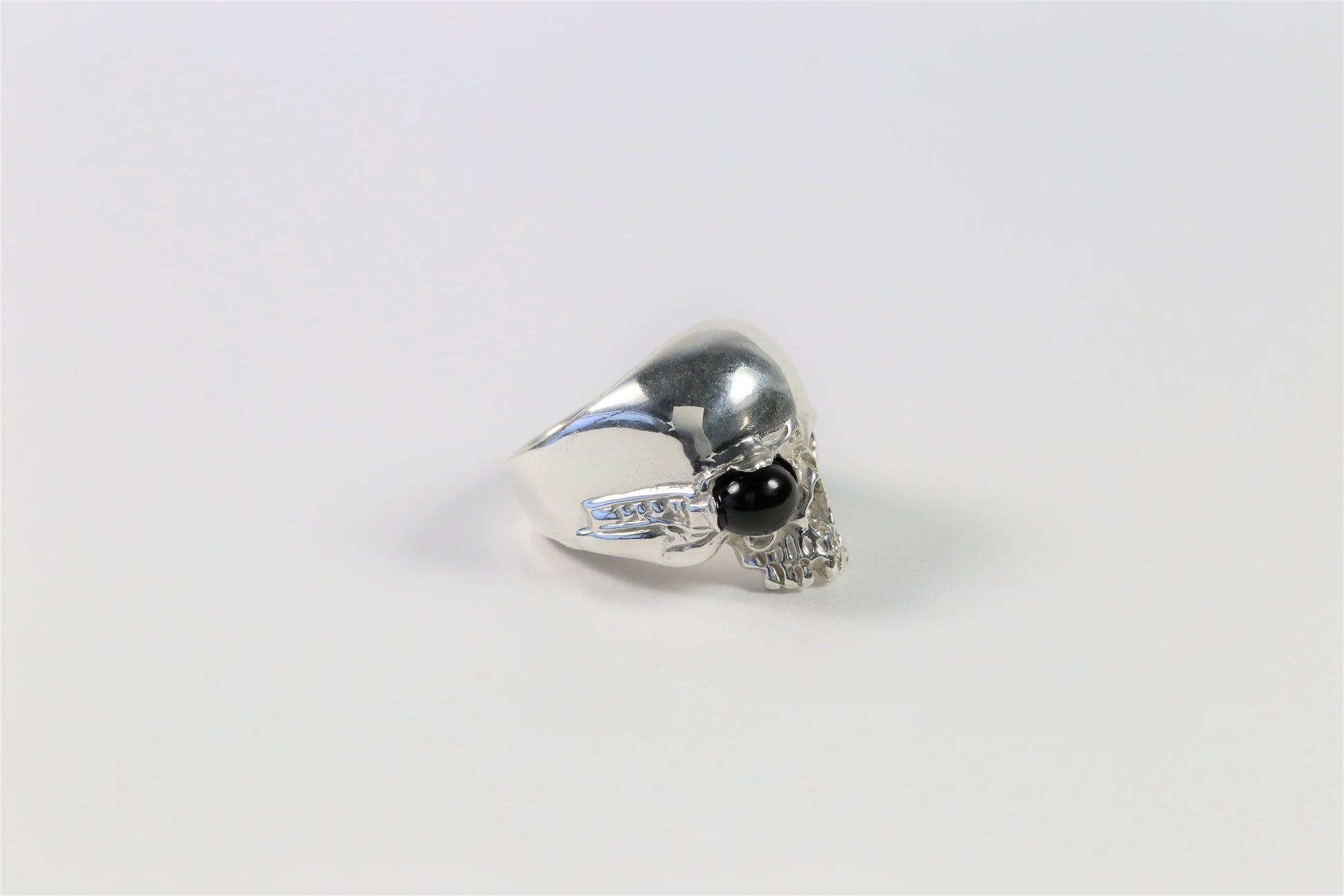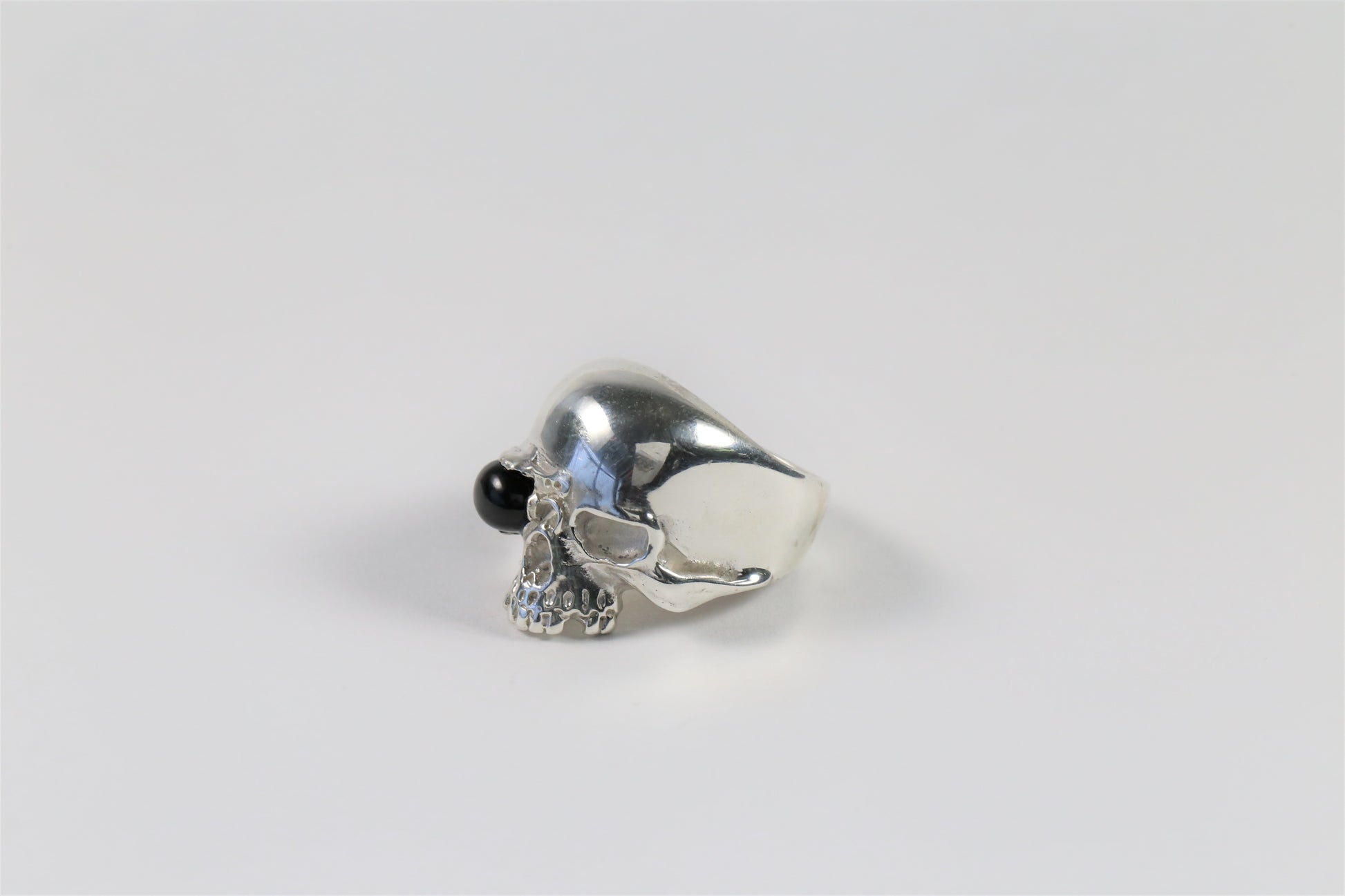 This lovely ring is crafted in sterling silver and features a skull with a black stone eyepatch and no jaw.
