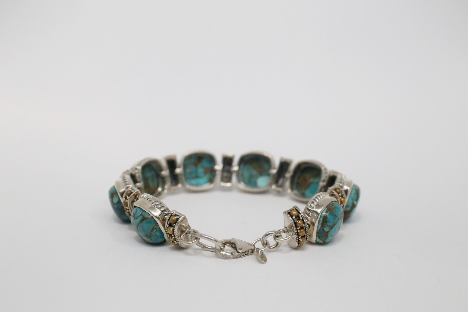 This handcrafted sterling silver bracelet showcases a series of cushion-shaped cabochons made from crushed turquoise, artfully set in raised bezel settings. The composite turquoise stones exhibit a vibrant mosaic of blues and earthy matrix tones, offering a textured, natural look. Each cabochon is separated by ornate spacer links adorned with oxidized silver and gold-tone beaded detailing, creating rich contrast and dimension. Finished with a secure lobster clasp, this piece blends artisanal craftsmanship with a bold, earthy elegance.