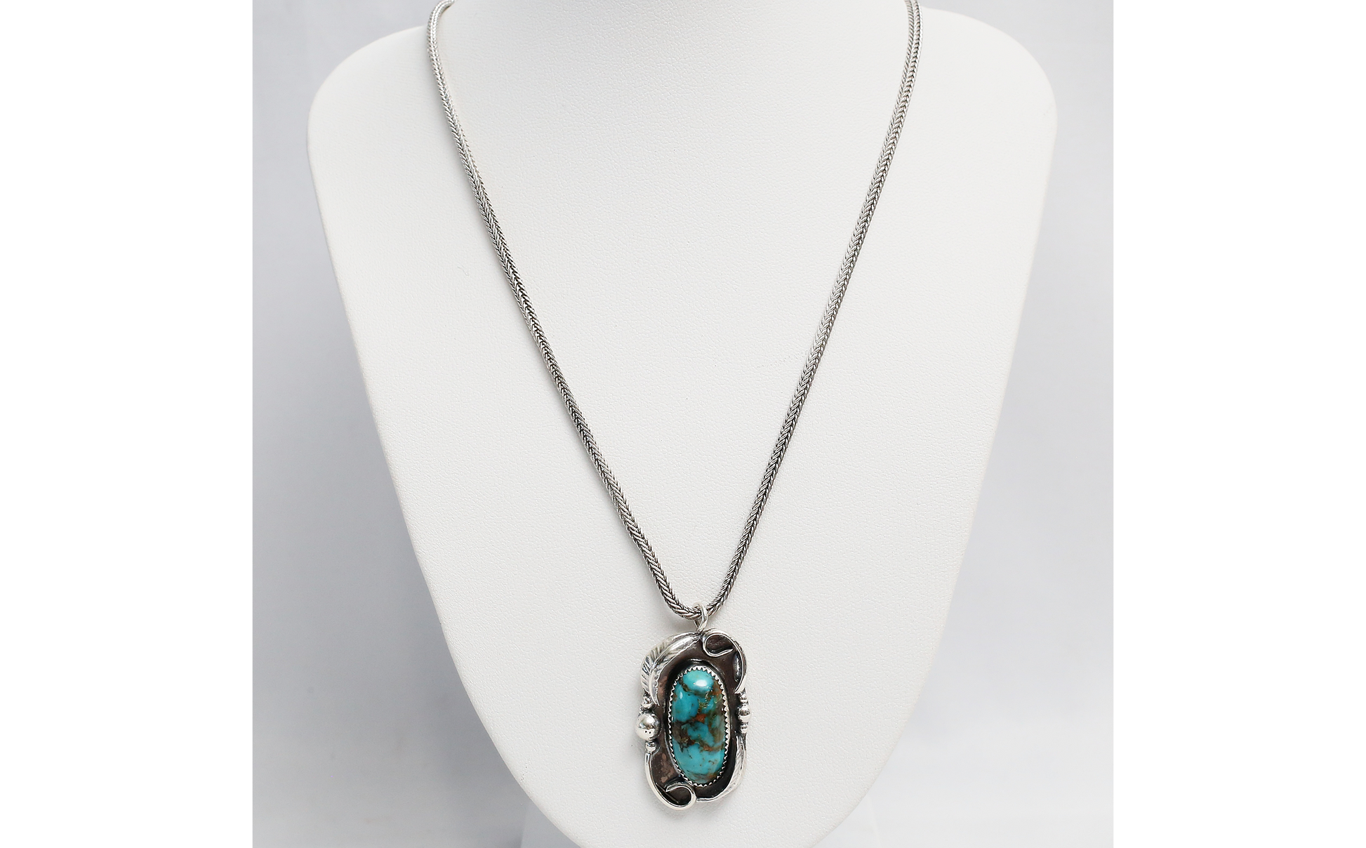 This striking piece features a polished sterling silver chain paired with a bold pendant showcasing an elongated oval turquoise stone with natural matrix patterns. The stone is framed in an ornate silver setting with flowing scrollwork and bead accents, adding dimension and artistry. A classic Southwestern-inspired design that highlights the vivid beauty of turquoise and the craftsmanship of sterling silver.