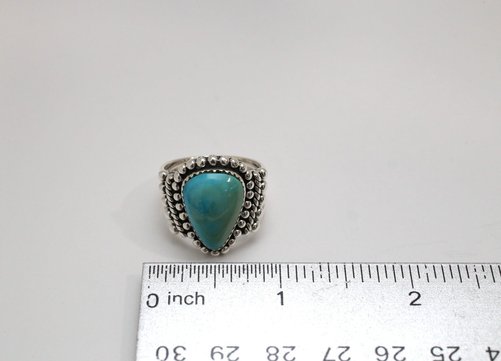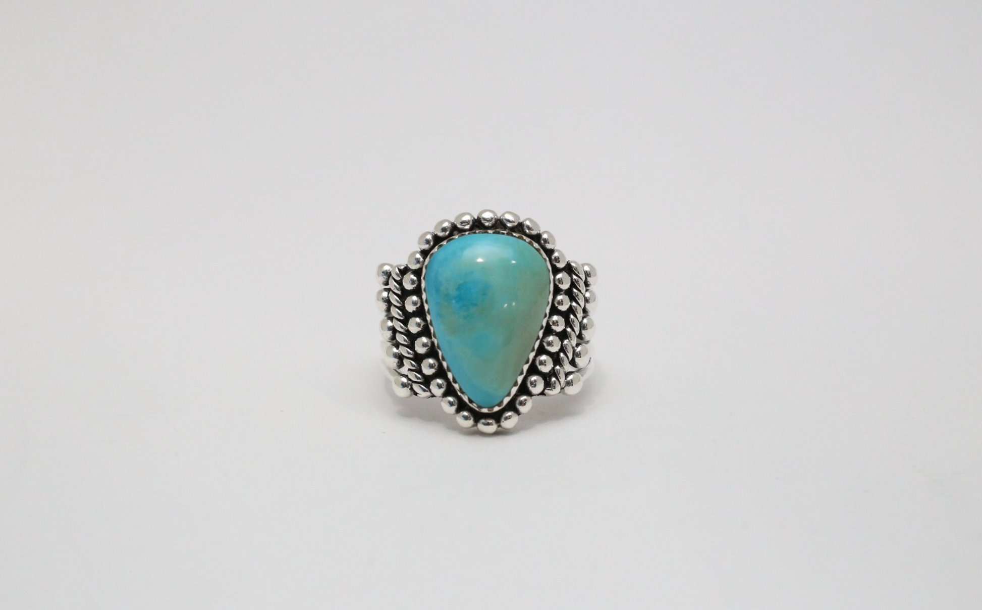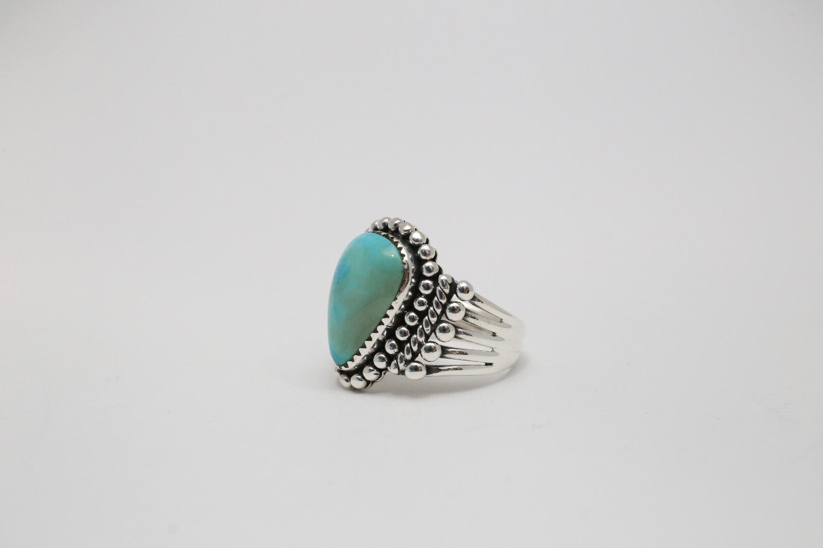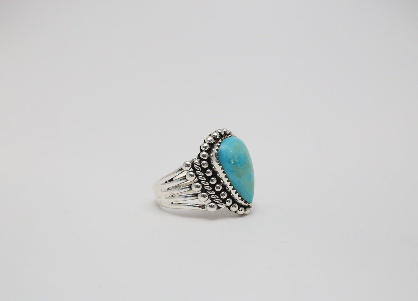 This bold sterling silver ring showcases a pear-shaped turquoise cabochon, bezel set and framed by a decorative beadwork halo. The wide, multi-ribbed band adds substantial presence, while the oxidized silver detailing enhances the contrast and depth. A striking piece, perfect for those drawn to Southwestern or artisan-style jewelry with a strong silhouette.