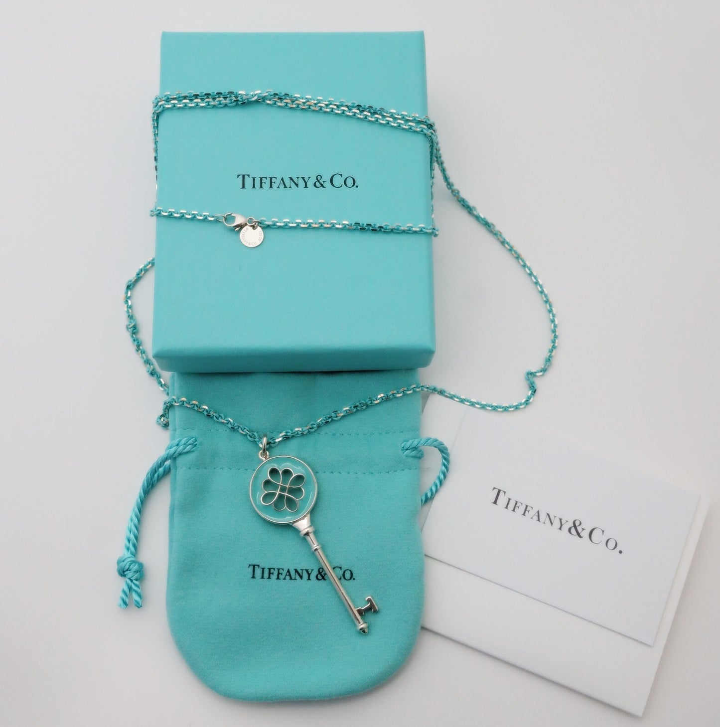 This Tiffany & Co. necklace features a vibrant sterling silver chain coated in the brand’s signature Tiffany Blue enamel, offering a playful yet refined aesthetic. Complimented by the a pendant with the classic Tiffany key design, also crafted in sterling silver, with a round enamel top adorned with an openwork four-leaf clover motif. Symbolizing luck and timeless elegance, this piece blends the whimsy of color with iconic Tiffany craftsmanship. It’s a standout accessory that balances bold detail with sophisticated charm.