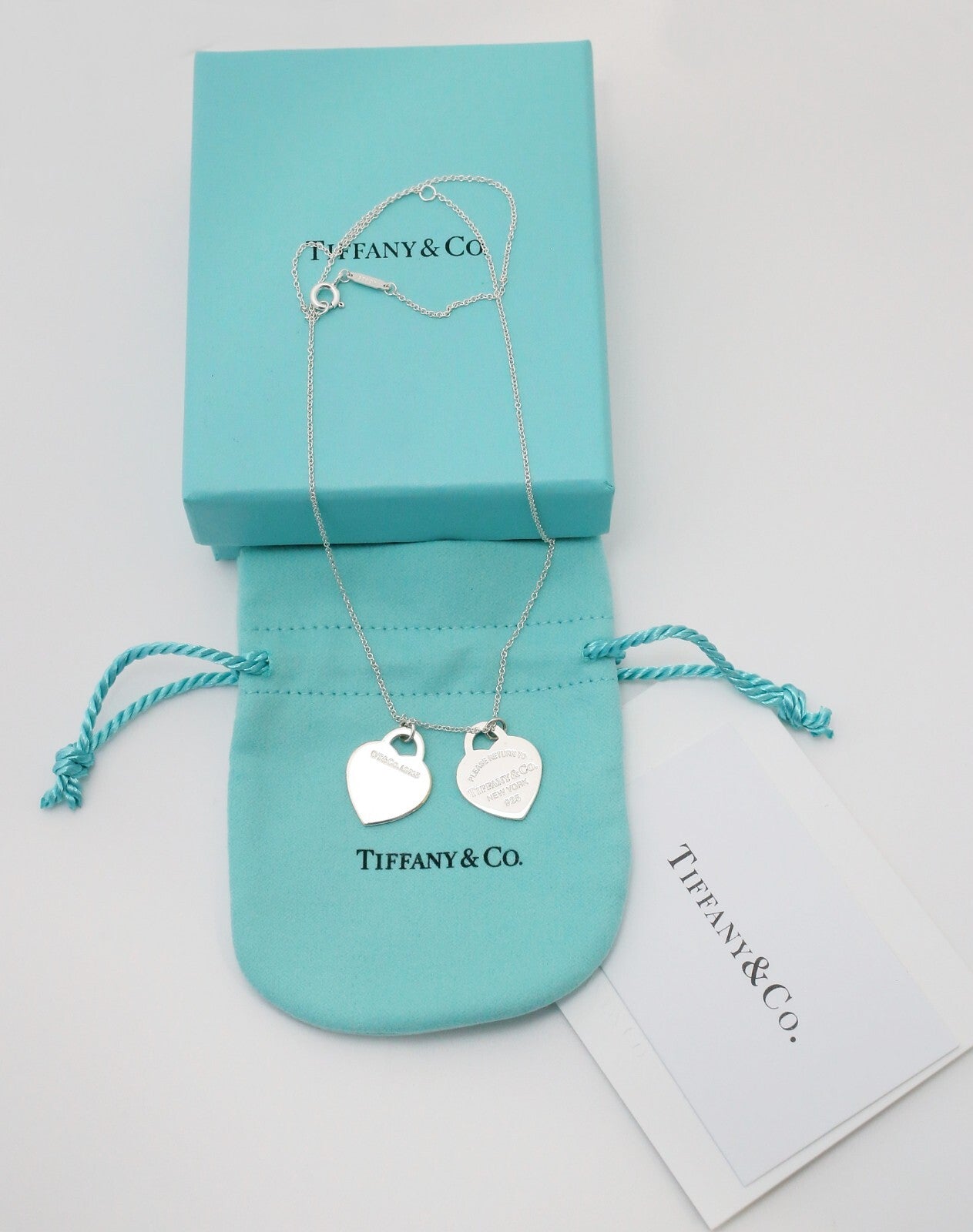 This Tiffany & Co. necklace features two heart tag pendants in sterling silver—one engraved with the classic “Please Return to Tiffany & Co. New York” inscription, and the other adorned with a bold red enamel finish. Suspended from a delicate chain, it blends timeless elegance with a vibrant, playful touch.