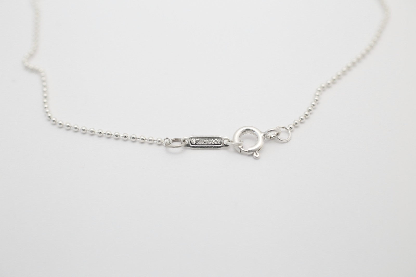 This Tiffany & Co. necklace showcases a heart-shaped tag from the Return to Tiffany® collection, rendered in a striking pink enamel finish with polished sterling silver accents. The pendant reads “Please Return to Tiffany & Co. NYC,” combining iconic branding with bold color. The heart tag hangs from a beaded ball chain, maintaining the youthful and playful aesthetic of the collection.