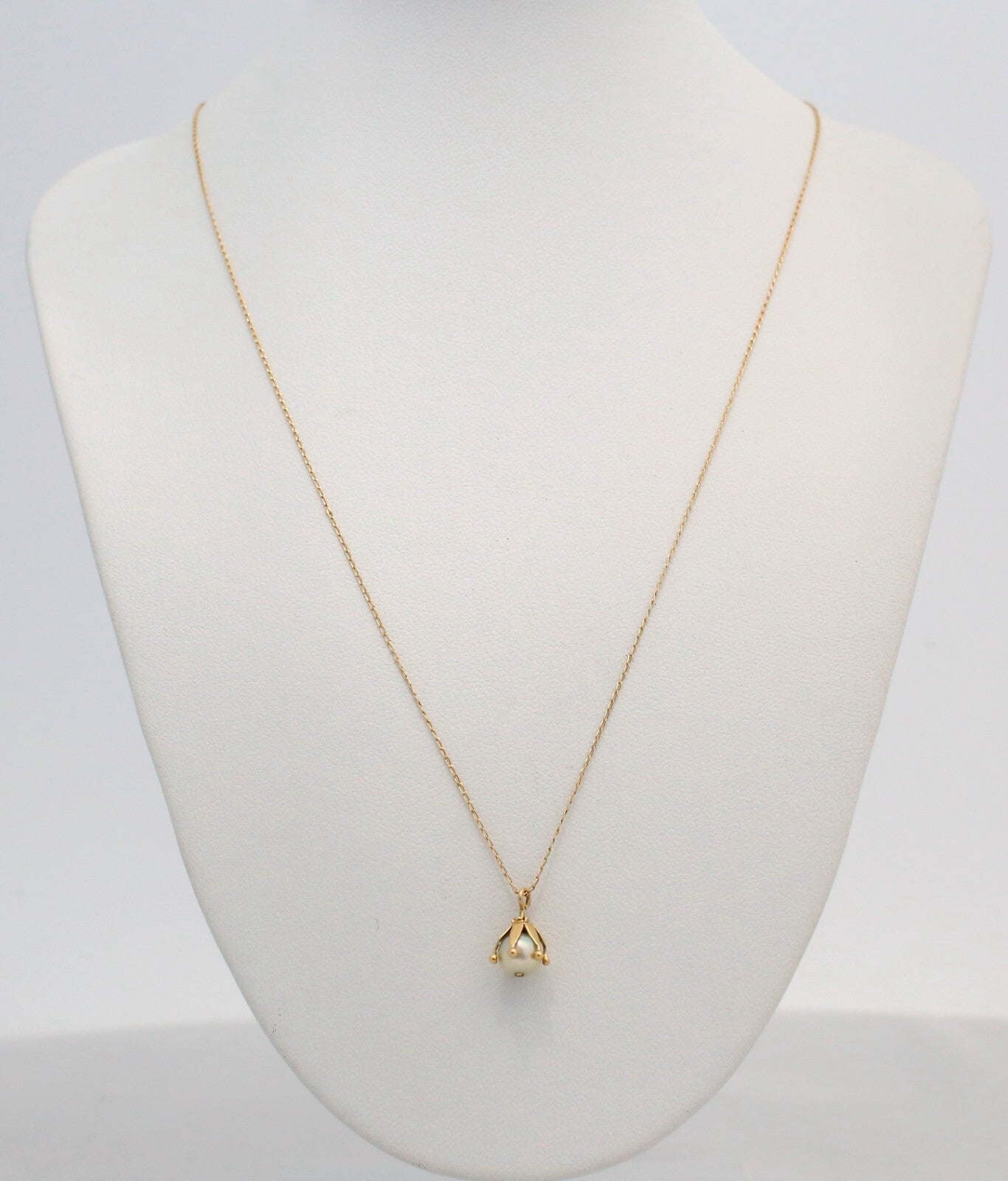 This lovely necklace is crafted in 14k gold and features a pearl in the pendant
