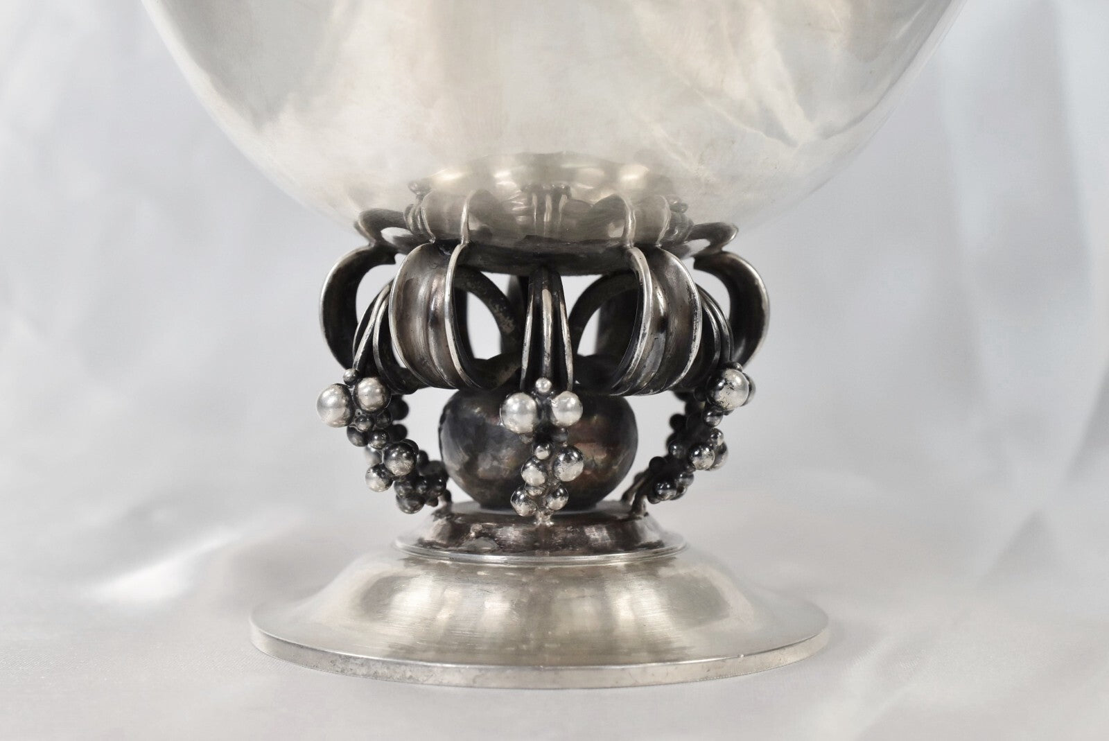 This exquisite Georg Jensen sterling silver bowl showcases the timeless elegance of Danish design, blending clean modern lines with intricate craftsmanship. The wide, flared form is gracefully balanced by a richly detailed base adorned with Jensen’s iconic grape and bead motif, creating a striking contrast between simplicity and ornamentation. A true statement piece, this bowl reflects the impeccable quality and artistry that define Georg Jensen’s legacy in silver.