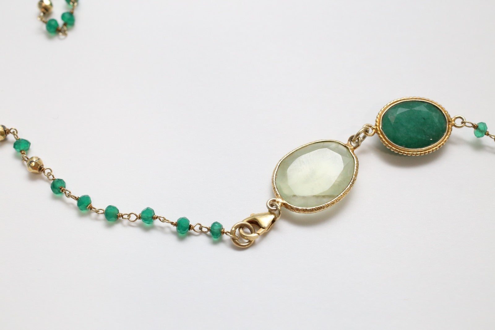 This long gold-tone sterling silver necklace features a delicate beaded chain interspersed with bezel-set green and translucent oval stones. Clusters of faceted teardrop-shaped stones form floral-inspired accents, adding dimension and organic elegance. The mixed textures and subtle shimmer create a refined, bohemian aesthetic, perfect for layering or wearing as a statement on its own.