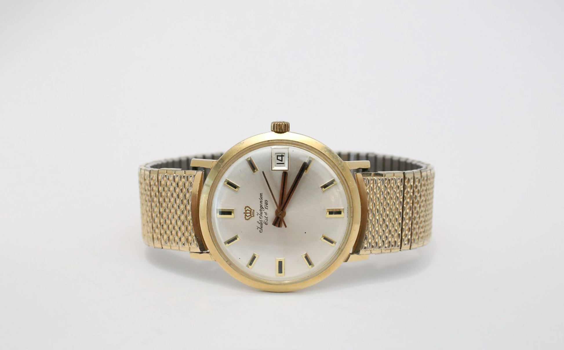 A timeless classic, this vintage Jules Jurgensen a 14k gold watch face featuring a champagne dial with bar markers, date window, and slim hands. Finished with an off-market textured stainless steel gold-tone mesh band