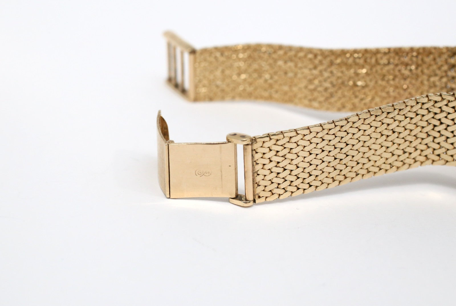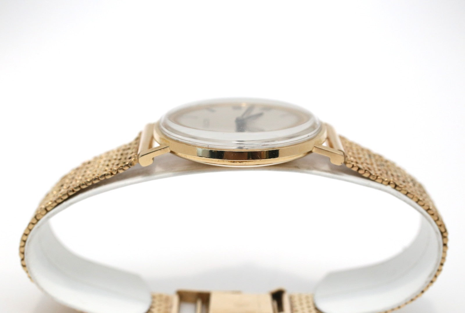 Timeless elegance meets classic craftsmanship in this vintage LeCoultre timepiece. The watch case is crafted in solid 18k yellow gold, this refined wristwatch features a sleek round case paired with a textured woven 14k gold bracelet for a seamless, luxurious look. The minimalist dial is adorned with slender Roman numeral hour markers and slim black hands, emphasizing simplicity and sophistication. The watch is powered by a manual wind movement and showcases the iconic LeCoultre signature at 12 o'clock.