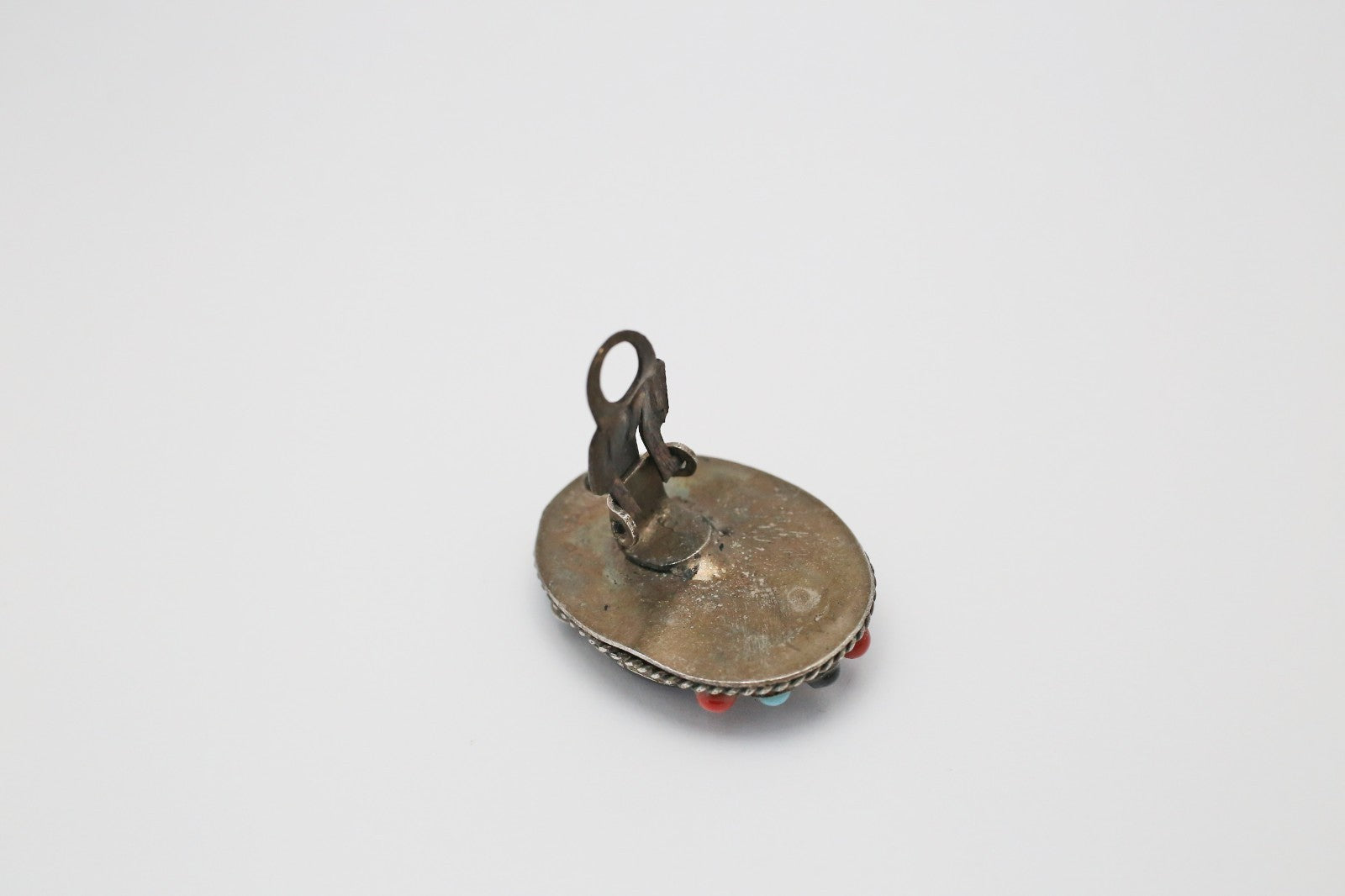 These vintage-style costume clip-on earrings feature an ornate oval design, set with glossy black cabochons and framed by small round faux turquoise and coral accents. The raised metal detailing showcases floral motifs, giving the earrings an antique, baroque-inspired look.