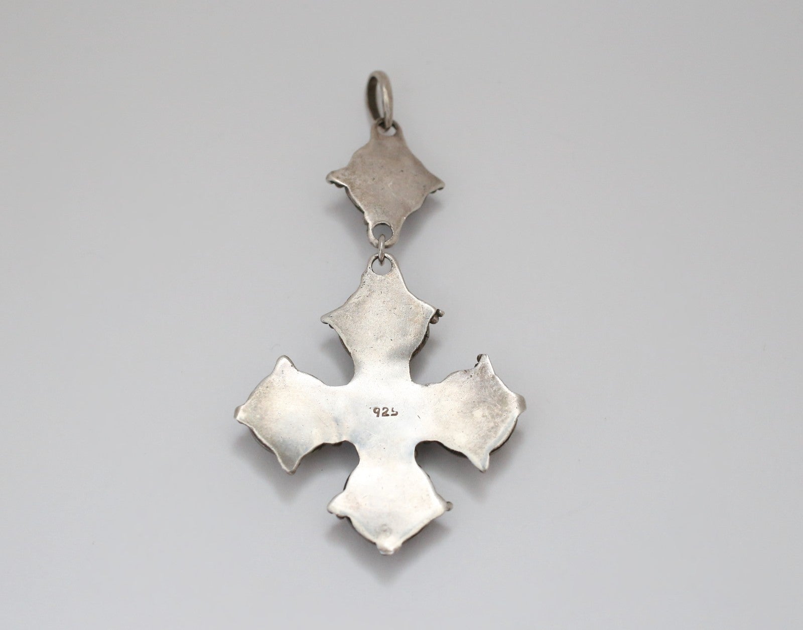 This bold vintage sterling silver pendant features six deep purple amethyst cabochons, each bezel-set and framed by intricately ribbed, oxidized silver borders that enhance their rich hue. A polished silver dome anchors the center, adding depth and symmetry to the design. Hand-linked segments give the piece subtle articulation, while a sturdy bail allows for versatile wear on chains or cords.