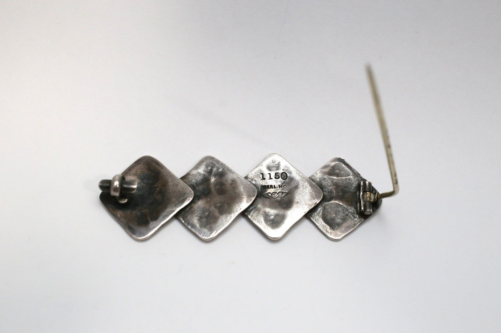 This antique sterling silver brooch features a striking row of four diamond-shaped panels, each adorned with a finely detailed classical profile in relief. The portraits appear to depict Greco-Roman figures, each uniquely rendered with period-appropriate headwear, from helmets to laurel crowns. The oxidized finish enhances the depth and texture of the engravings, lending an aged, museum-like quality to the piece.