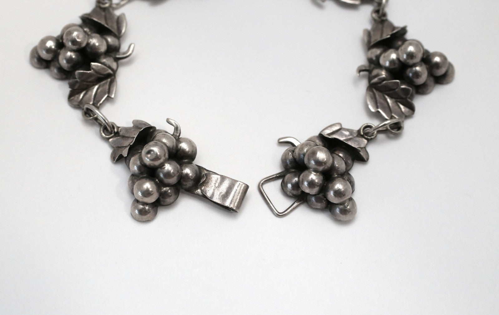 Vintage sterling silver bracelet featuring clusters of raised grape motifs and detailed leaf accents. Each link is crafted in a dimensional design, creating a charming vineyard-inspired piece with a rustic patina finish.