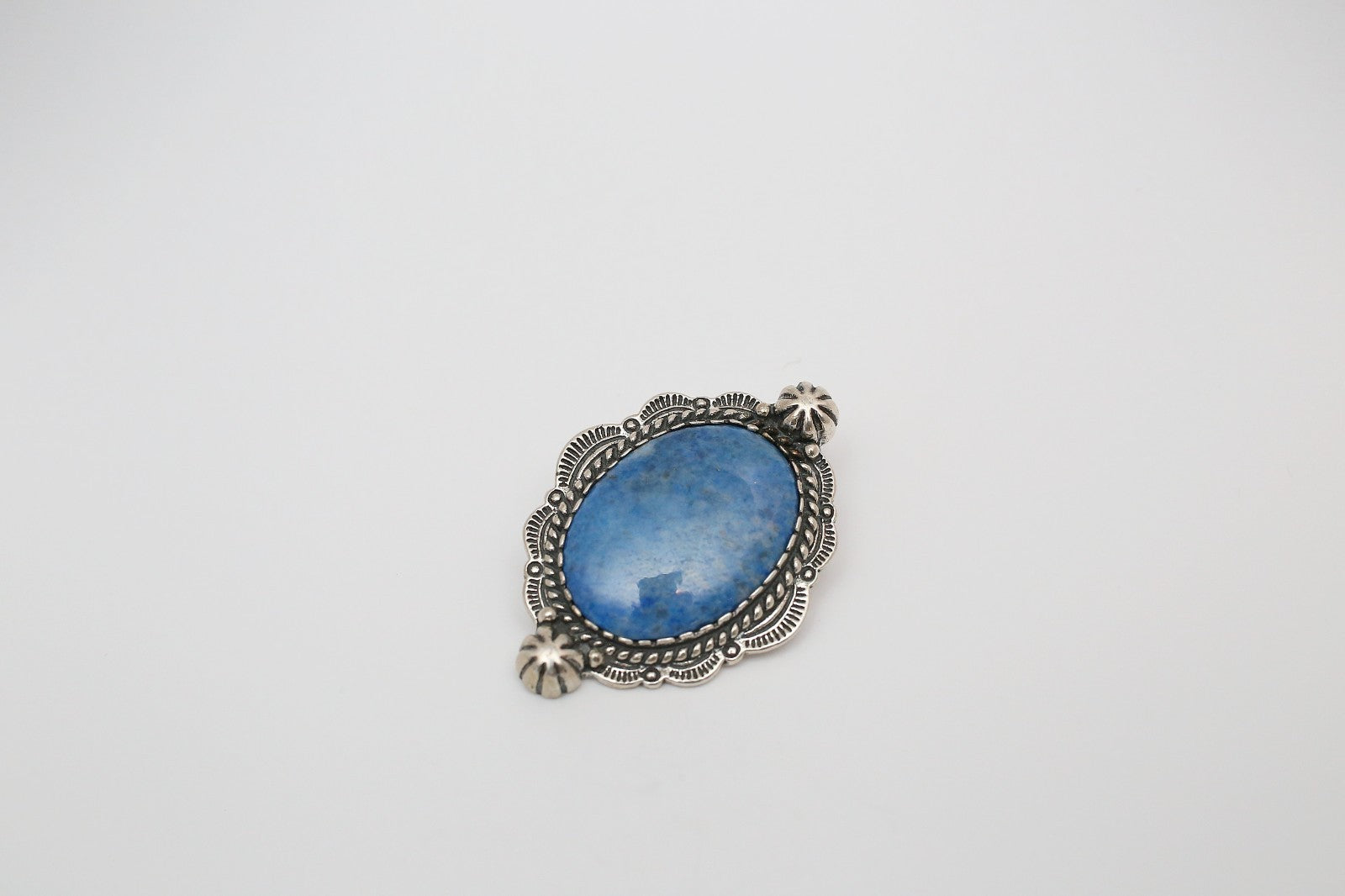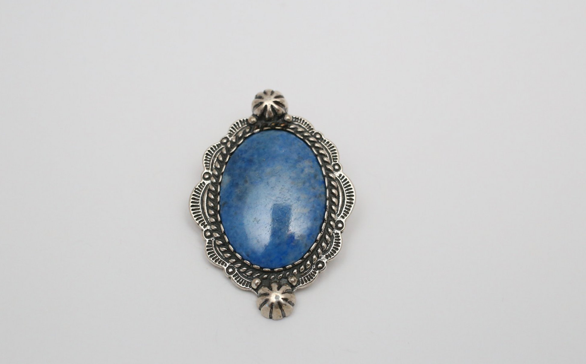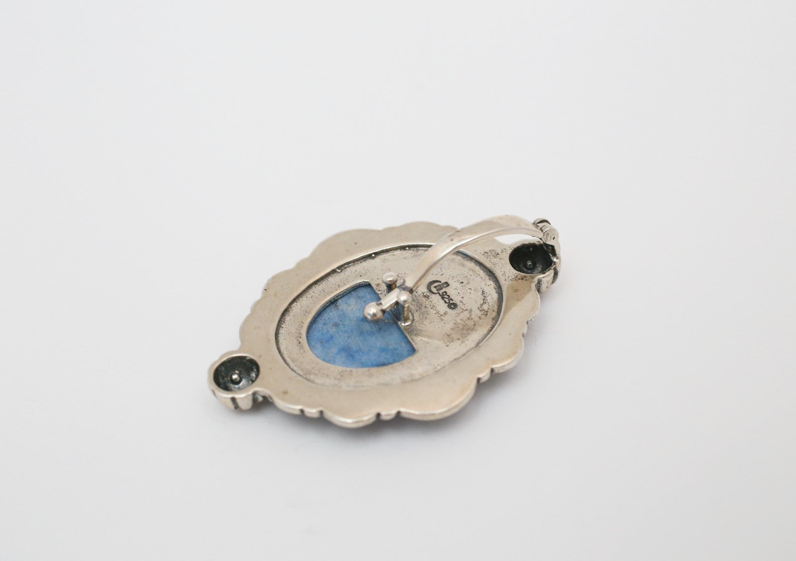 This vintage sterling silver pendant features a striking oval blue stone set in a handcrafted bezel adorned with a scalloped and rope-accented border. The silverwork showcases traditional Southwestern-style motifs, including stamped floral embellishments at the top and bottom, adding a balanced and ornate finish. The split backing plate reveals the stone’s natural matrix and confirms its authenticity.