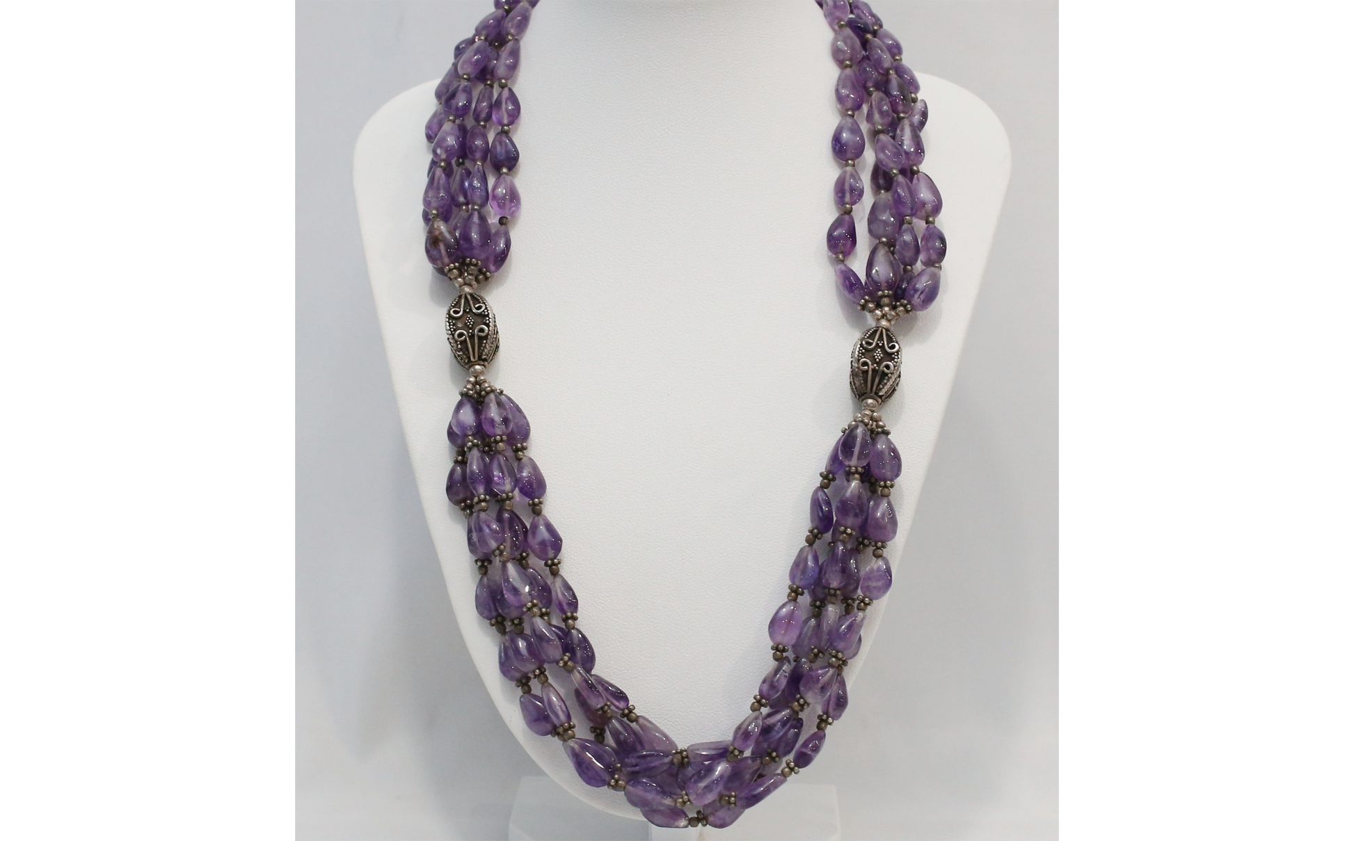 This elegant sterling silver necklace features cascading strands of polished amethyst teardrop beads, each spaced with delicate silver accents for added shimmer and movement. The strands are joined by ornate sterling silver filigree beads, adding a touch of vintage charm and craftsmanship. Finished with a handcrafted hook-and-eye clasp, this necklace beautifully blends rich color and artisan detailing, making it a refined yet bold statement piece.