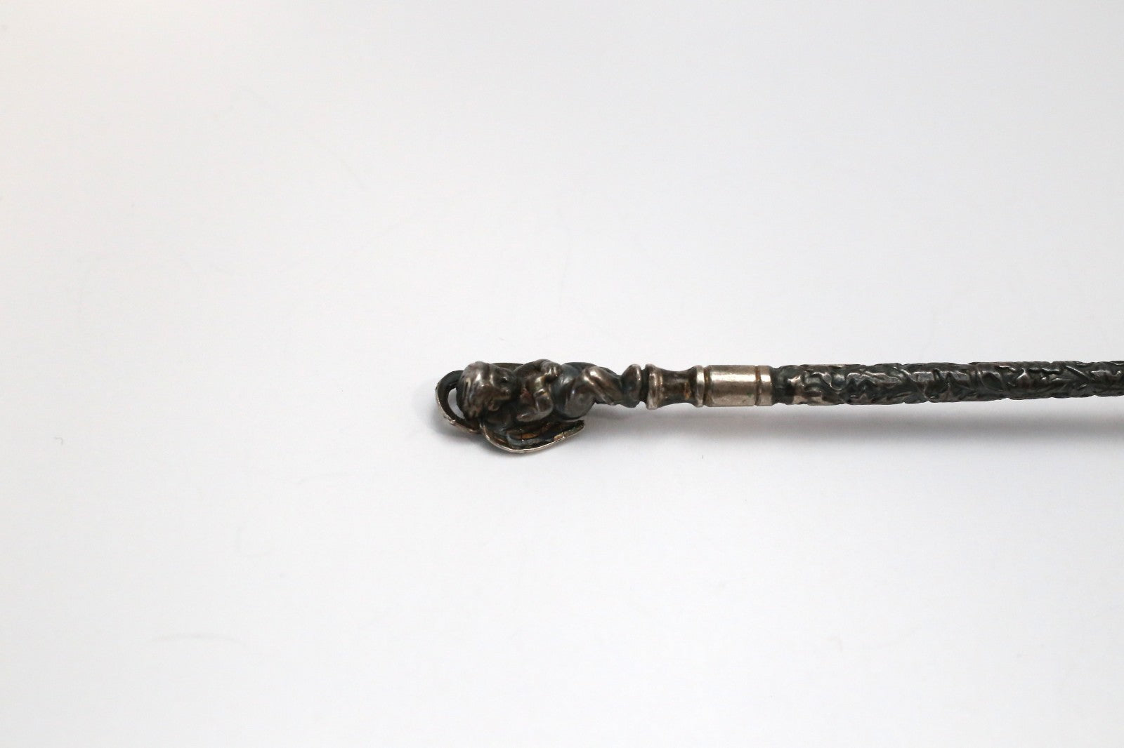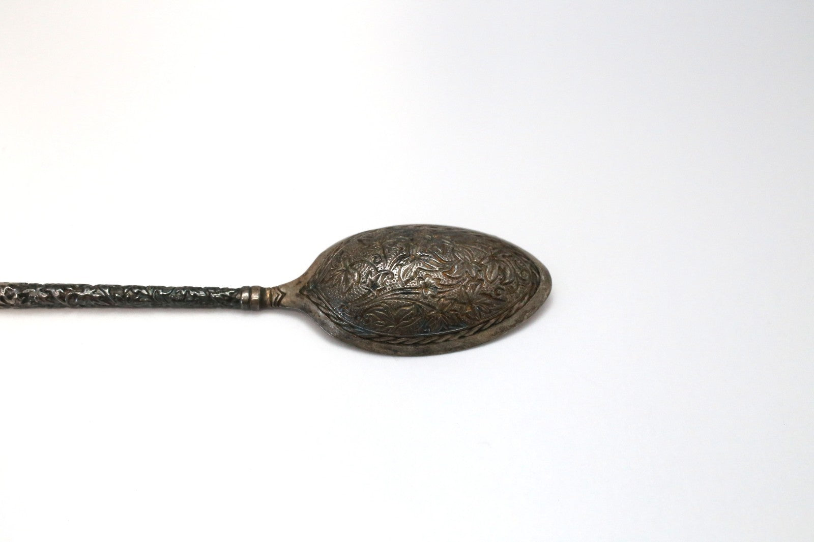 Vintage sterling silver tea spoon with detailed floral engravings on both sides of the bowl and a textured handle topped with a cherub. Beautiful patina highlights its intricate design. Rich patina enhances its aged character.