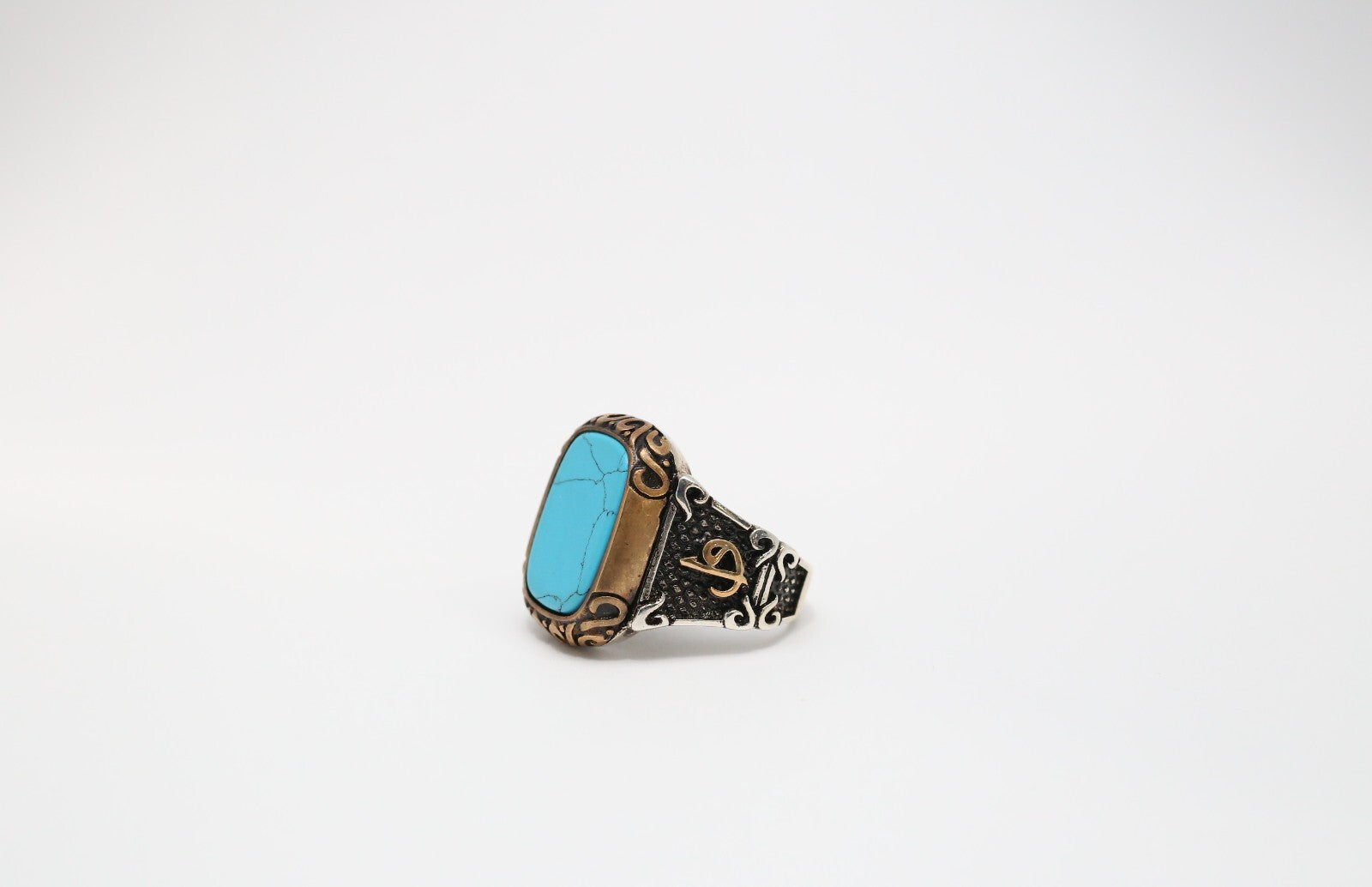 This beautiful vintage ring is crafted in sterling silver and features a large turquoise gemstone.