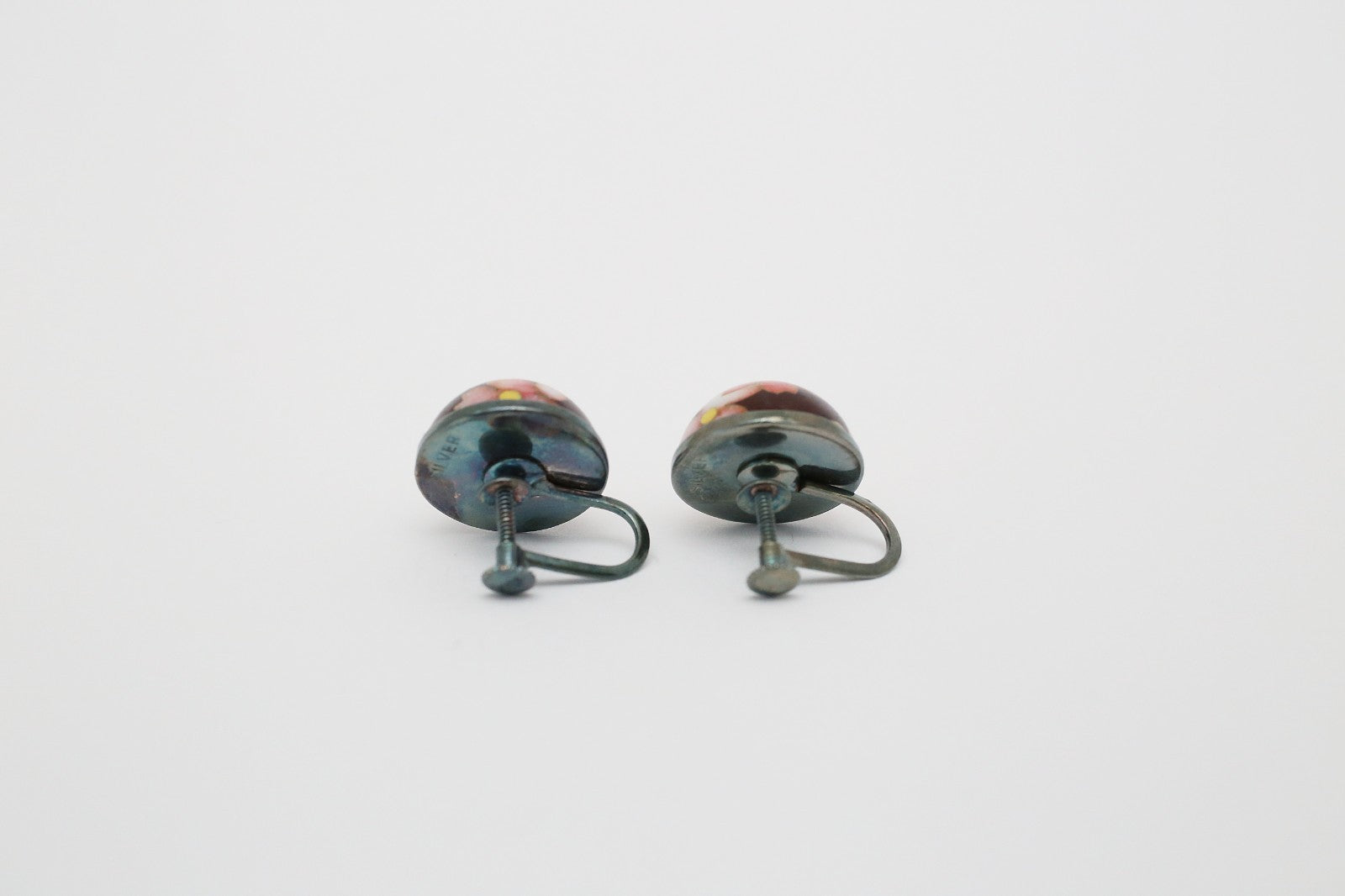 Vintage Sterling Silver Domed Flower Enamel Earrings, 7.7g